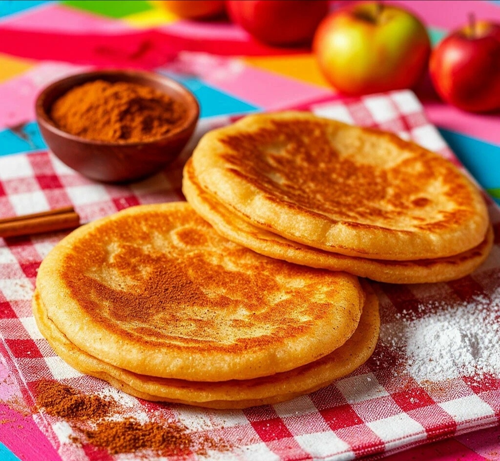 ИНГРЕДИЕНТЫ (на 4 больших лепёшки): 🧾📦 ·Для теста: готовое дрожжевое тесто — 250 г ИЛИ (на кефире): кефир — 200 мл, мука — 250 г, разрыхлитель — 1 ч.л., соль — щепотка. ·Для начинки: яблоко (кисло-сладкое) — 1 крупное 🍎, сахар — 2-3 ст.л., корица молотая — 1 ч.л., ванилин — на кончике ножа. ·Для жарки: масло растительное — 100-150 мл ·Для подачи: сахарная пудра — 2-3 ст.л. ❄️