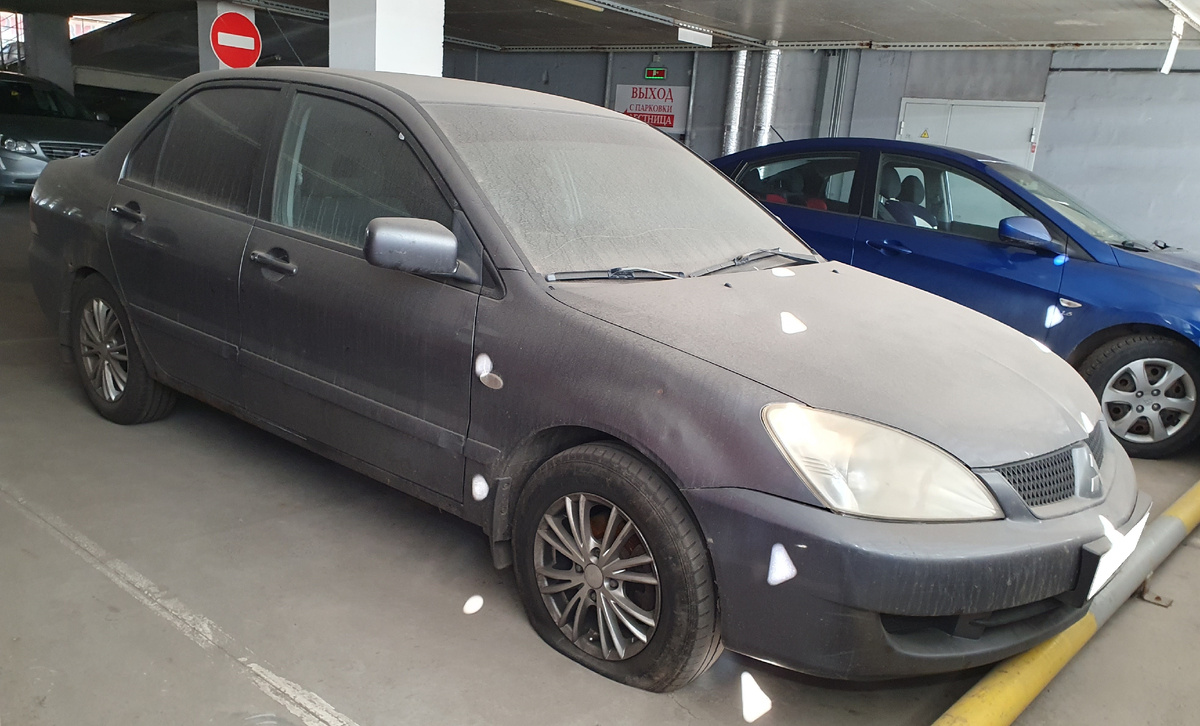 • Шины полностью изношены. Правое переднее колесо спущено.