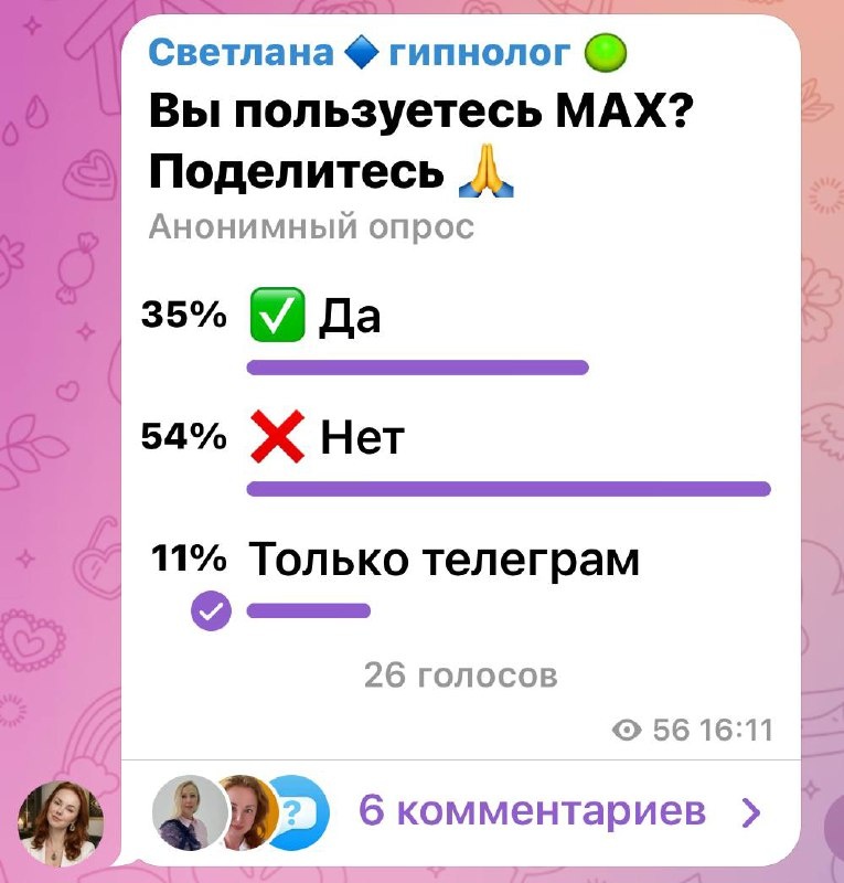 Я увидела что 35% используют MAX значит пора тоже зарегистрироваться для удобства общения написать в МАХ - останемся на связи ❤️ ❤️❤️❤️❤️❤️❤️❤️❤️❤️❤️ |Контакты |написать в МАХ | Сайт с услугами| Полезное в группе |Тест на диагностику биополя