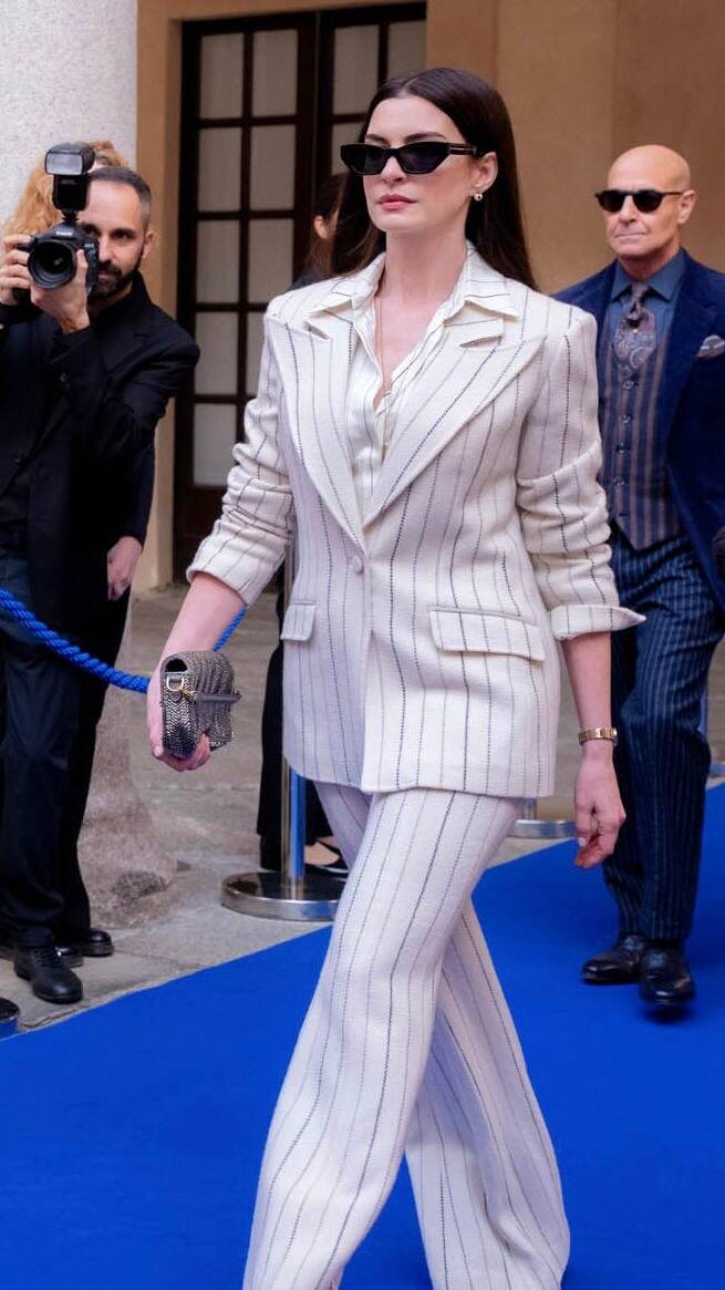 Сколько стоит один из образов Энди Сакс из второй части «Дьявол носит Prada», который мы увидели в недавно вышедших трейлере и первых официальных кадрах? Героиня Энн Хэтэуэй появилась в сдержанном костюме Gabriela Hearst из шерсти и кашемира в тонкую полоску. Классический тейлоринг дополнили шелковая блуза в тон, мини-версия сумки Fendi Baguette и очки из коллаборации Oliver Peoples x Khaite. 1. Жакет Gabriela Hearst - $3 560 (примерно 272 000 рублей) 2. Брюки Gabriela Hearst - $1 910 (около 146 000 рублей) 3. Блуза Gabriela Hearst - $1 650 (примерно 126 000 рублей) 4. Сумка Fendi - $4 300 (около 329 000 рублей) 5. Очки Oliver Peoples x Khaite - $590 (примерно 45 000 рублей) Итого стоимость образа получилась около 919 000 рублей. Больше в тгк Историк Мод Анатоль Вовк.