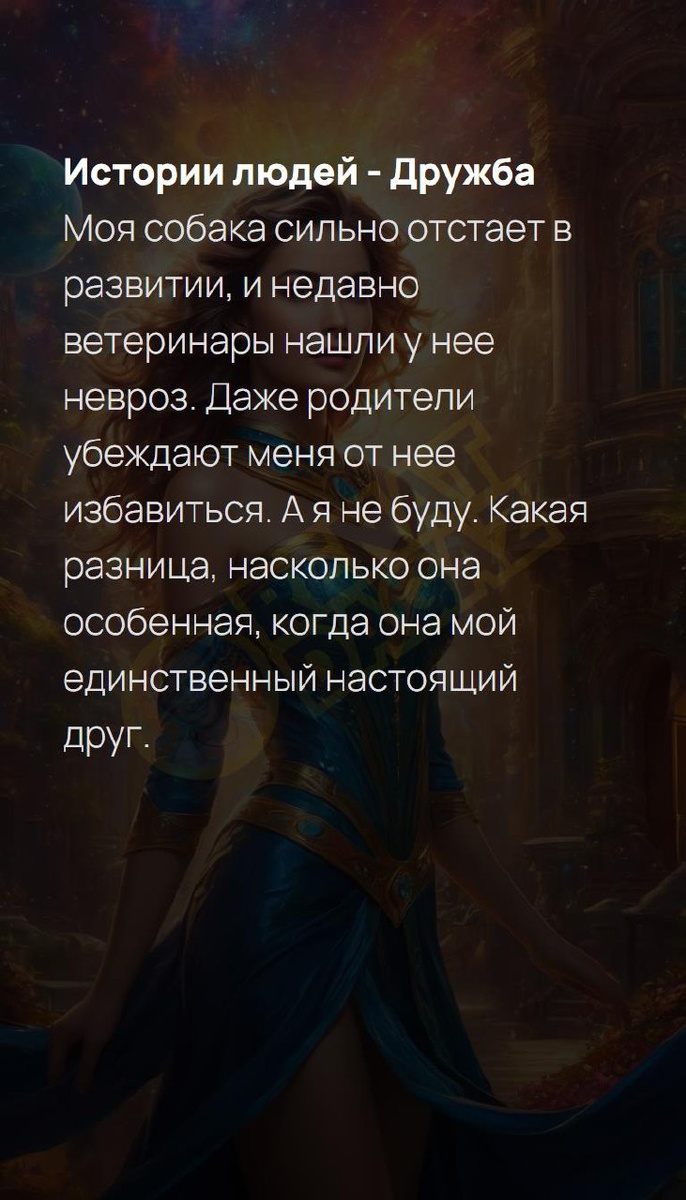 Истории людей - Дружба Моя собака сильно отстает в развитии, и недавно ветеринары нашли у нее невроз. Даже родители убеждают меня от нее избавиться. А я не буду. Какая разница, насколько она особенная, когда она мой единственный настоящий друг. Ваш Ангел и Демон | Архитектура вашей души T | VK | Pin | YouTub | Dzen #каждыйважен #ценности #бабушкиидедушки #мывприручили #мораль #улыбка #помощьдетям #случайность #профессионализм #3число #3февраля