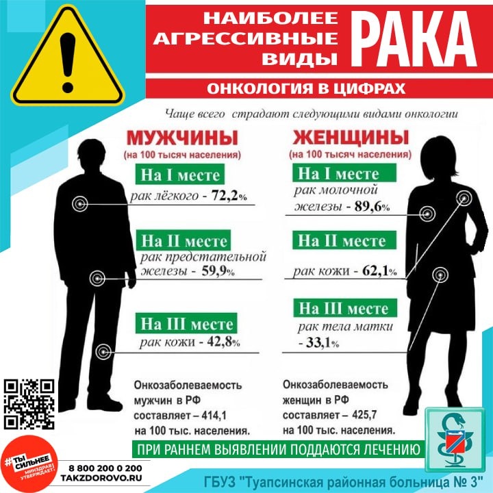 ⚠️ Есть виды рака, которые отличаются повышенной агрессивностью, они плохо поддаются лечению и довольно быстро дают метастазы, поэтому для человека критически важно определить их на как можно более ранней стадии. ‼️ Наиболее агрессивными видами рака онкологи сейчас считают рак желудка, поджелудочной железы, легкого, яичников, а также меланому. Например при раке молочной железы, даже в той стадии, когда уже пошли метастазы, имеется много шансов выжить, а если речь идет о раке желудка в той же стадии, то прогноз крайне неблагоприятный. 💊 Сейчас онкологи научились неплохо лечить лимфому, даже когда рак захватил почти все лимфоузлы, то благоприятный исход может быть вероятен. К сожалению, в случае рака легкого, такой уверенности у врачей нет. ✅ Несмотря на то, что методы лечения постоянно совершенствуются, наибольшую эффективность терапия дает на начальных стадиях болезни, поэтому рекомендуем своевременно проходить профосмотр и диспансеризацию. #укреплениеобщественногоздоровья