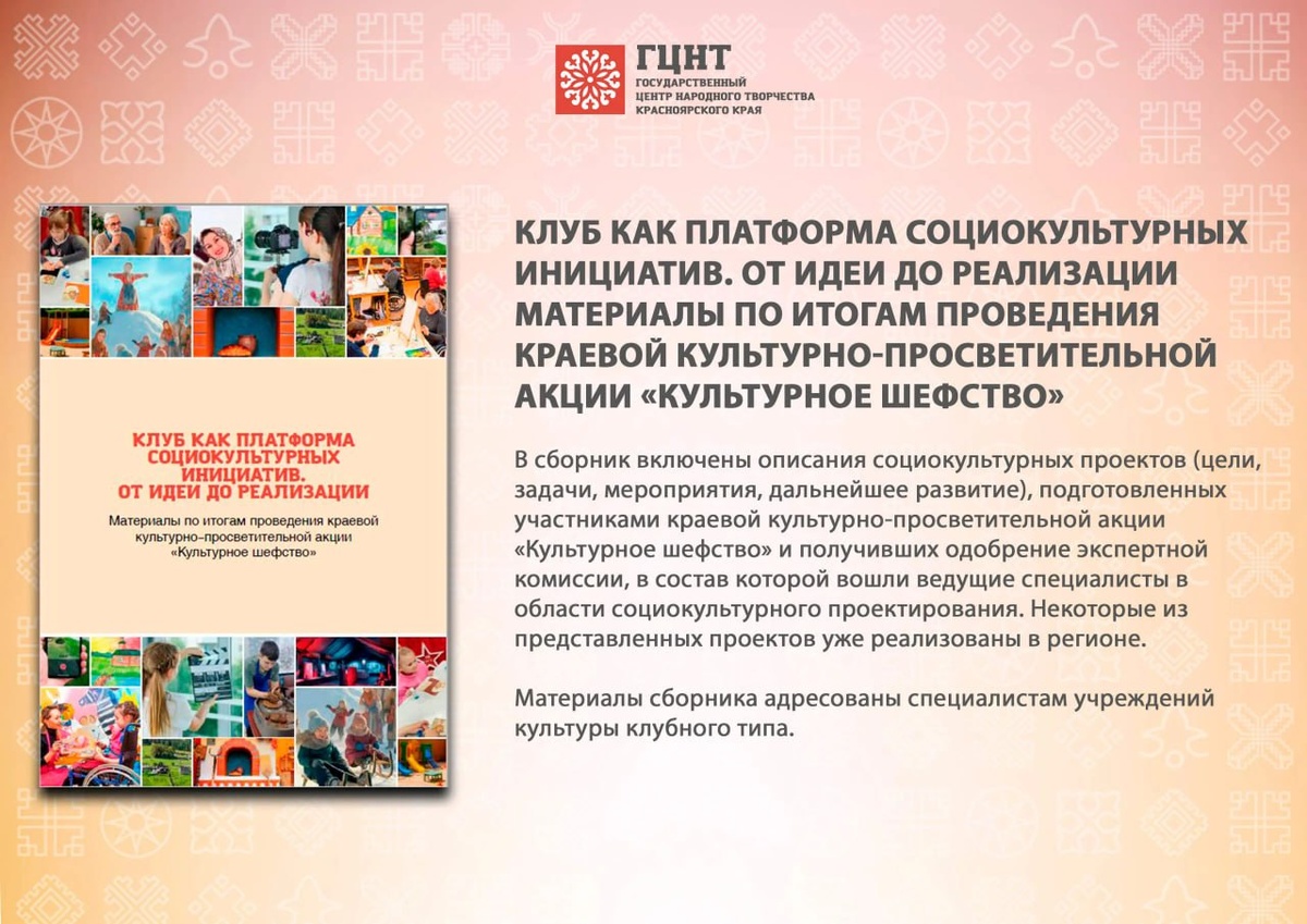 !🌟 #Книжная_полка_krasfolk В нем представлены описания 22 интересных социокультурных проектов, разработанных участниками краевой культурно-просветительной акции «Культурное шефство» и получивших одобрение экспертной комиссии, в состав которой вошли компетентные специалисты в области социокультурного проектирования. Некоторые из проектов уже успешно реализованы в Красноярском крае! Этот сборник – отличный ресурс для специалистов учреждений культуры клубного типа, которые хотят вдохновиться новыми идеями и развивать культурную жизнь в своём регионе. Хотите узнать, как создать креативное пространство, провести фестиваль или запустить инклюзивную студию? Здесь есть конкретные примеры с целями, задачами и планами развития! Прочитать сборник можно здесь. #КрайВысокойКультуры #культураКрасноярья