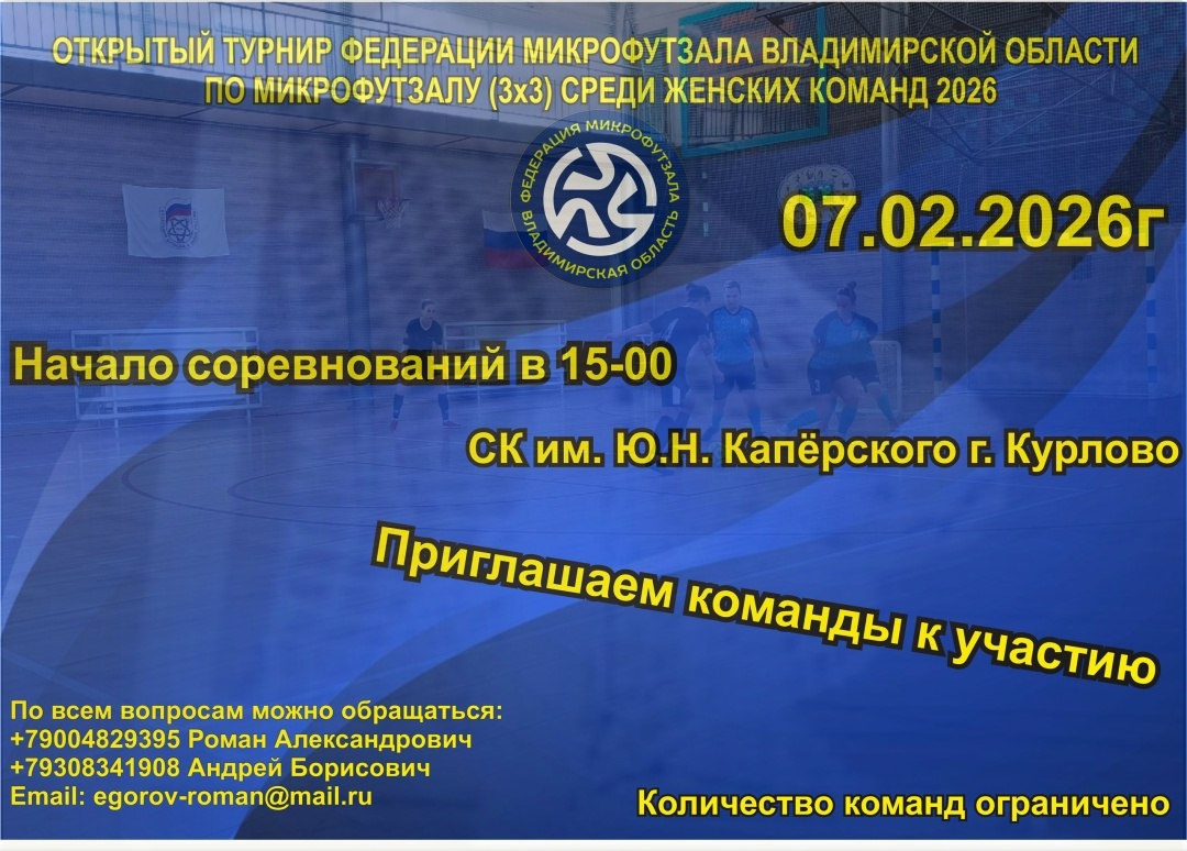 ! Приглашаем команды к участию в открытом турнире Федерации микрофутзала Владимирской области по микрофутзалу 3х3 среди ЖЕНСКИХ команд. Место проведения: спортивный комплекс имени Ю.Н. Каперского в городе Курлово. По всем вопросам можно обращаться: +79004829395 Роман Александрович +79308341908 Андрей Борисович Email: egorov-roman@mail.ru