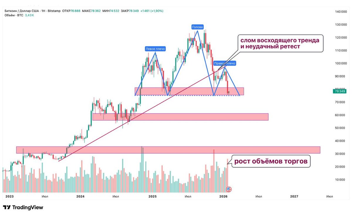 👉🏻 2021–2022: −77% Что говорит техника 📉 На старших таймфреймах отчетливо видна модель Голова и плечи с линией шеи в районе $78–82 тыс. Сейчас цена тестирует эту зону. Это может быть шанс на отскок, но пробой шеи вниз станет сильным сигналом к дальнейшему падению. Если это криптозима, то куда 🤔 Первая серьёзная поддержка цены находится на уровне $62–60 тысячи. А максимальная зона падения может быть в районе $35–30 тысяч. Это соответствует историческим просадкам в 72–76%. 📍 Подробнее в статье на сайте