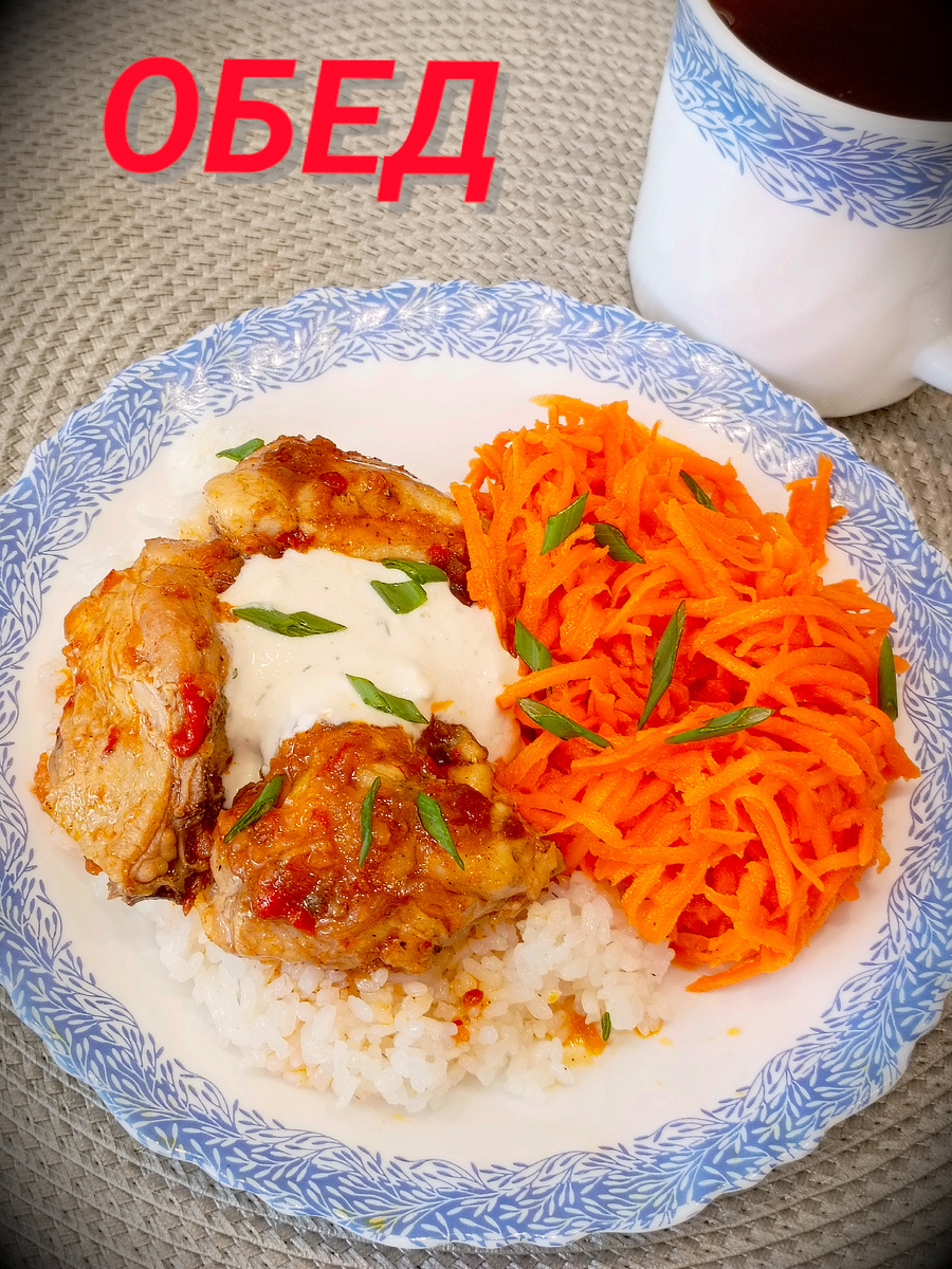 Днём ранее я приготовила морковь по-корейски, и сегодня решила добавить её к своему обеду. Она и стала ярким акцентом моего обеда. Морковка получилась очень сочной — домашняя, выращенная на моей даче.