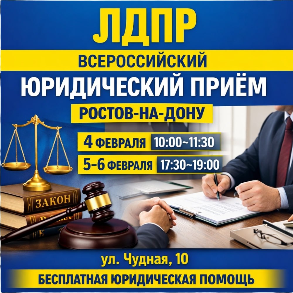 ✨✨✨ С 4 по 6 февраля 2026 года Ростовское региональное отделение ЛДПР проводит Всероссийский юридический приём — бесплатные консультации для жителей, которые нуждаются в правовой помощи. 🔹Место проведения: г. Ростов-на-Дону, ул. Чудная, 10 🔹 График приёма: 🔹 4 февраля — с 10:00 до 11:30 🔹 5 и 6 февраля — с 17:30 до 19:00 С какими вопросами можно обратиться: 🔹 жилищно-коммунальные проблемы; 🔹 социальные выплаты и льготы; 🔹 трудовые споры; 🔹 вопросы пенсий, пособий, наследства; 🔹 защита прав граждан и другие правовые ситуации. ❗ ЛДПР последовательно отстаивает принцип: помощь людям — не на словах, а на деле. Всероссийский юридический приём — это реальная возможность получить поддержку, разобраться в проблеме и выстроить дальнейшие шаги по её решению. Дорогие подписчики, благодарим Вас за поддержку! Ваши реакции, приглашения друзей и репосты позволяют нам развиваться. Не забывайте ставить 👍👍👍