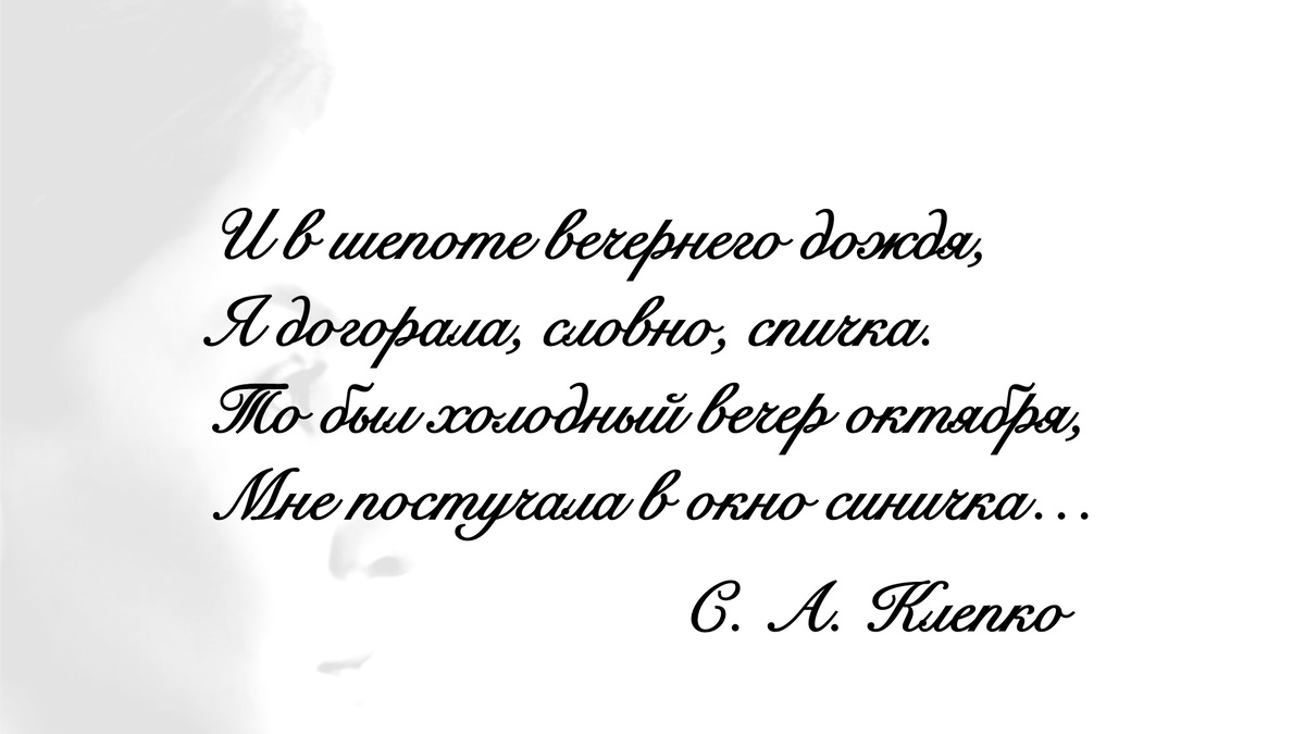 Автор С. А. Клепко *** И в шёпоте вечернего дождя, Я догорала, словно, спичка. То был, холодный вечер октября, Мне постучала в окно синичка. Её глаза, как бусинки блестели, Она в упор смотрела на меня. И фонари сквозь дождь горели, То был холодный вечер октября. __________________________________________________________________________________________ * Все права защищены. Воспроизведение любой части стихотворения, в какой бы то ни было форме и какими бы то ни было средствами, возможно только с указанием автора. __________________________________________________________________________________________ Мои стихотворения собраны в подборке ПОЭЗИЯ. Социальные сети: #культура #искусство #стихи #поэзия #творчество #философия #klepkosa #клепко #стихиоосени #любовь #осень #меланхолия #женщинапоэт #современнаяпоэзия
