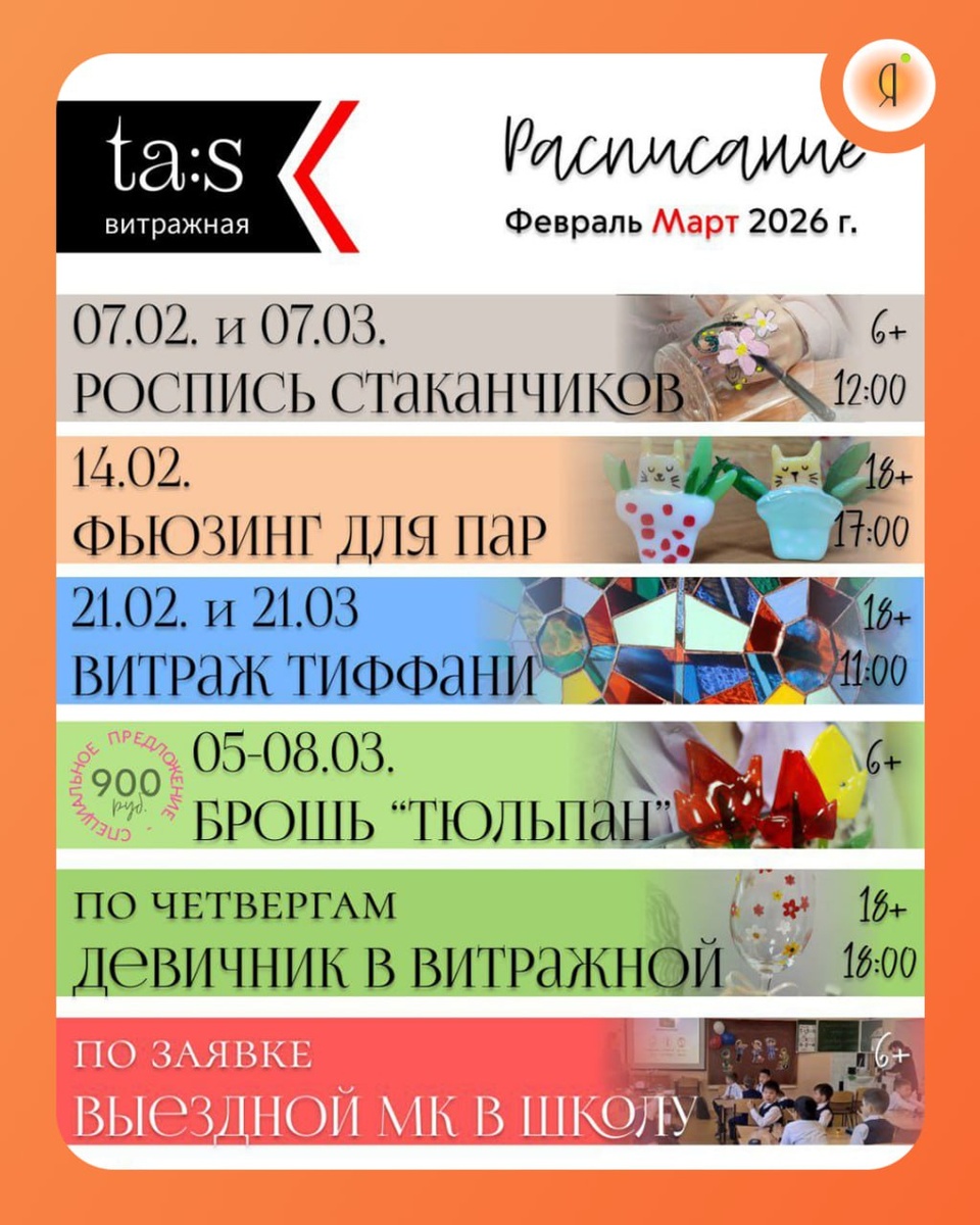 » #МК Первая в Якутске мастерская витража приглашает попробовать новый вид досуга: от росписи до спекания стекла при 800 градусах. Доступно для детей и взрослых. 7.02 | 12:00 Роспись стаканчиков 6+ 14.02 | 17:00 Фьюзинг для пар 18+ 21.02 | 11:00 Витраж Тиффани 18+ 5-8.03 Брошь «Тюльпан» 6+ 7.03 | 12:00 Роспись стаканчиков 6+ 21.03 | 11:00 Витраж Тиффани 18+ По четвергам | 18:00 Девичник в витражной 18+ По заявке Выездной МК в школу 6+ 🤩 Подробнее в канале @taas_glass Online Якутия | Ждем вас в МАХ