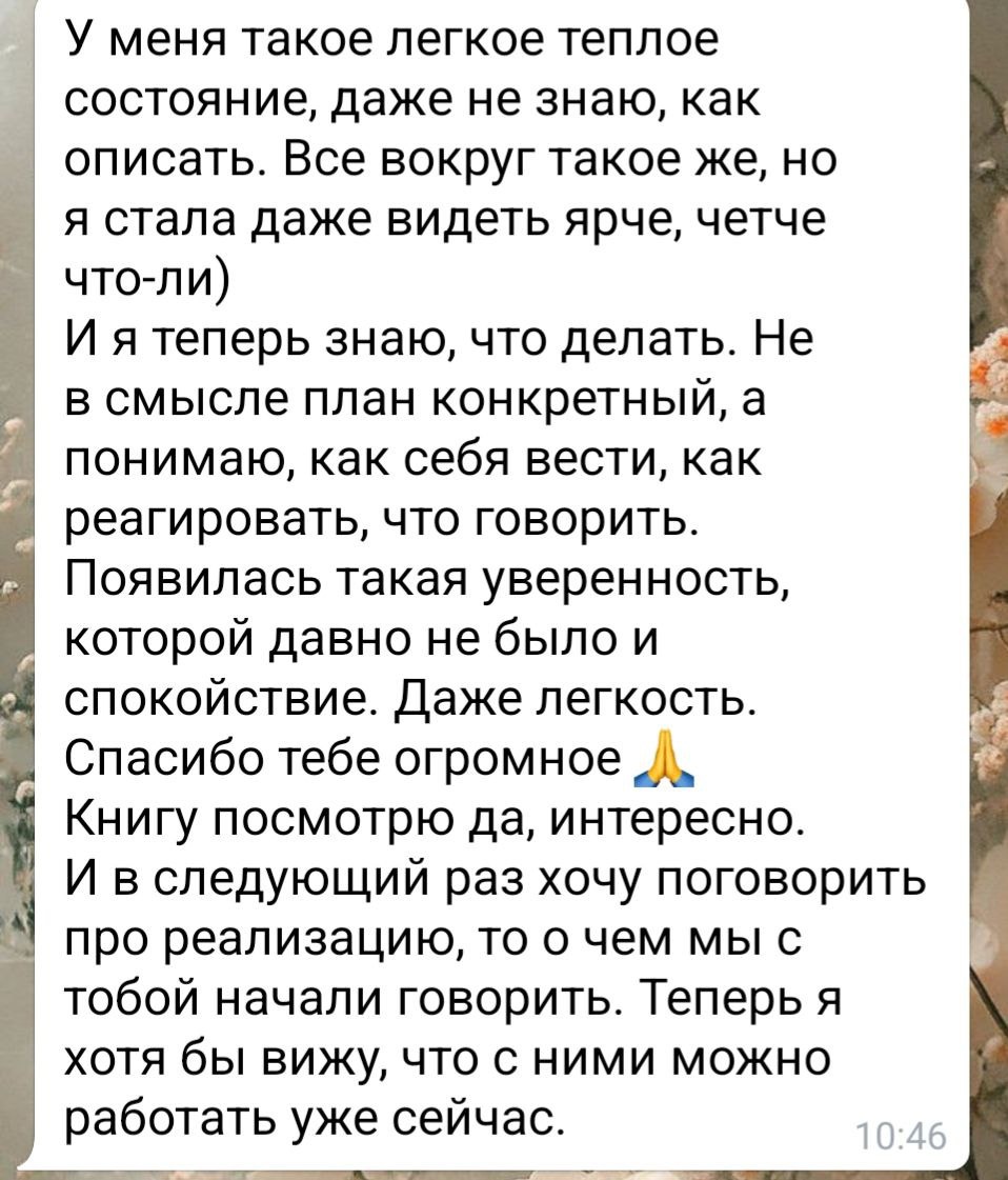 С разрешения - делюсь фрагментом своей работы. Она написала с ощущением, что "больше не могу держать все внутри, боюсь, что если начну говорить - меня совсем размажет". На сессии мы выявили ту самую болезненную эмоцию, связанную с переживаниями, и работали не через анализ, а через образ этого чувства: как выглядит, где ощущается в теле, что хочет сказать. Благодаря этому - мягко и быстро - выпустили эмоции, подавляемые годами, напряжение тут же ушло: "Мне стало легко. Я наверное впервые за долгое время чувствую себя так спокойно." Назначили следующую встречу, потому что увидела и почувствовала - это работает. 📩 Если вы узнали себя - пишите: "Это про меня". Еще отзывы можно посмотреть через поиск🔍 в правом верхнем углу🙏