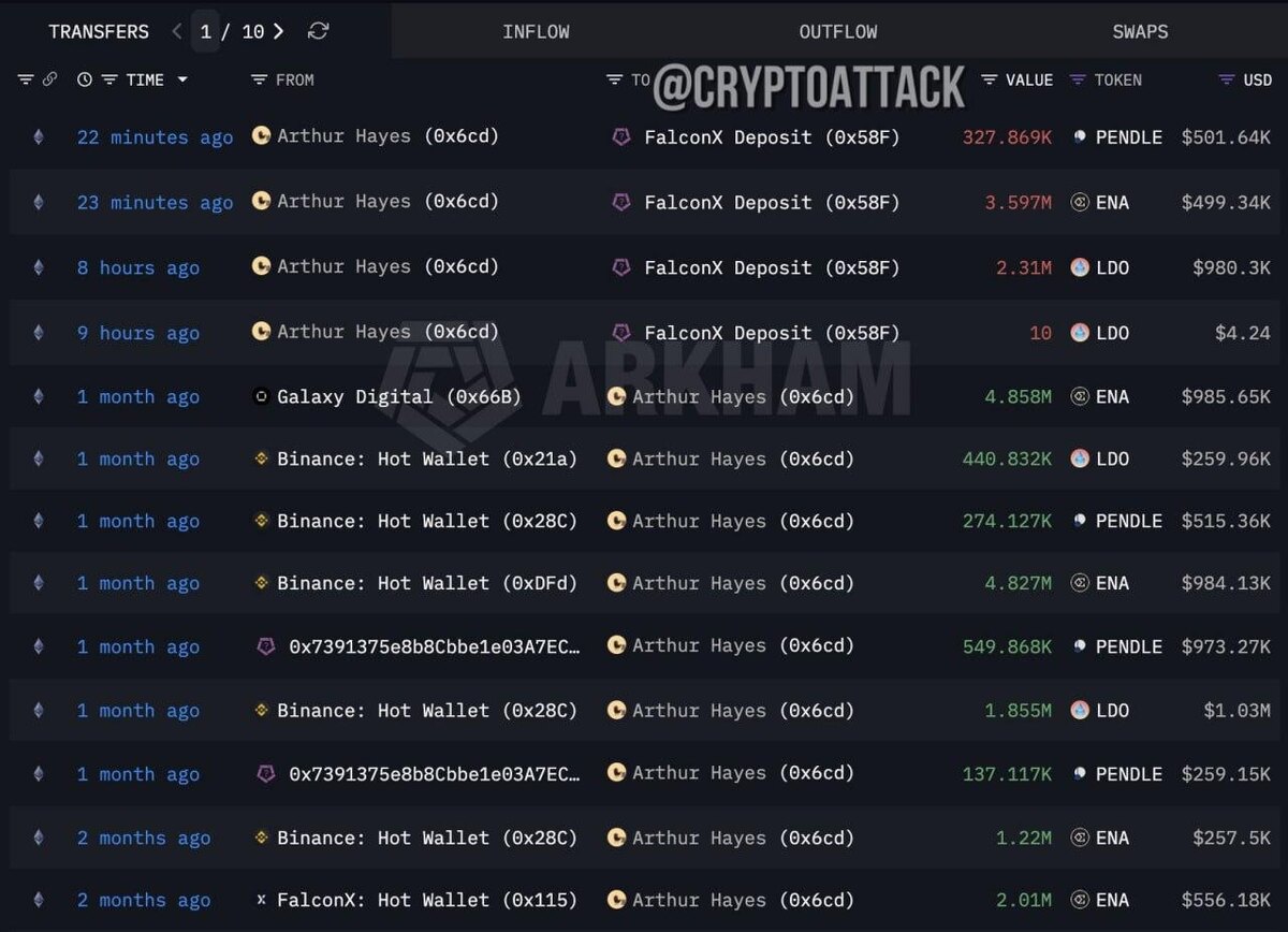 : - Купил 1,4 млн #PENDLE ($2,87 млн) по цене $2,06 и продал 327 869 #PENDLE ($502 тыс) по цене $1,53 $; - Купил 15,8 млн #ENA ($3,6 млн) по цене $0,23 и продал 3,6 млн #ENA ($499 тыс) по цене $0,14; - Купил 2,3 млн #LDO ($1,29 млн) по цене $0,56 и продал 2,31 млн #LDO ($980 тыс) по цене $0,42. Кто не в курсе, Артур - это легенда, ех-СЕО Bitmex, который брил хомяков на своей бирже так, как даже CZ с SBF не снилось. А теперь бреют его самого. А все почему? Потому что в крипте, на дистанции, невозможно заработать на лонгах. Либо холд Битка. Либо шорт всего остального. Рано или поздно я перейду ТОЛЬКО на эту модель. @7yapavlenko