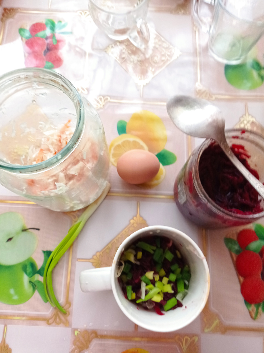 "На занятиях в садике воспитатель дала задание слепить четыре овоща. Вовочка пошёл сдавать свою работу самый последний. Приносит большую тарелку из пластилина, а на ней много маленьких кусочков пластилина. Воспитатель спрашивает: — Что это, Вовочка? А где же твои овощи? — А я их уже в салат порезал!" Вот и я уже почти порезала, правда только зеленый лук. Для салата положила в большую кружку квашенную капусту-2 ст.л. без верха, свекольную борщевую заправку-2ст.л. без верха.
