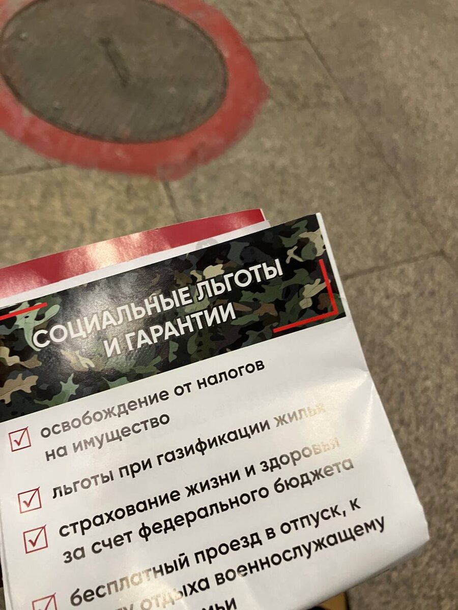 Брошюры без выходных данных раздают прямо у рамок металлоискателей на станции «Площадь Гарина Михайловского». Кроме того, лозунги «успей присоединиться к своим» о заключении контракта звучат в некоторых муниципальных автобусах (наряду с напоминанием об опасности мошенников, которые могут притворяться сотрудниками силовых ведомств) (Фото от читателя «Сибирского экспресса») Подписаться| Прислать новость| Помочь бустами
