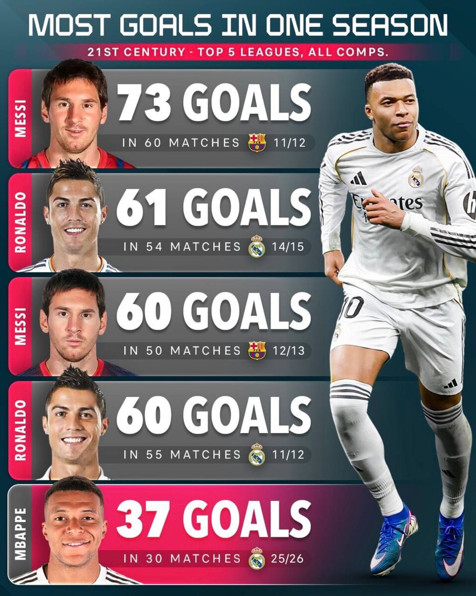 🤔 А что если Мбаппе повторит или перебьет рекорд Месси по голам в одном сезоне