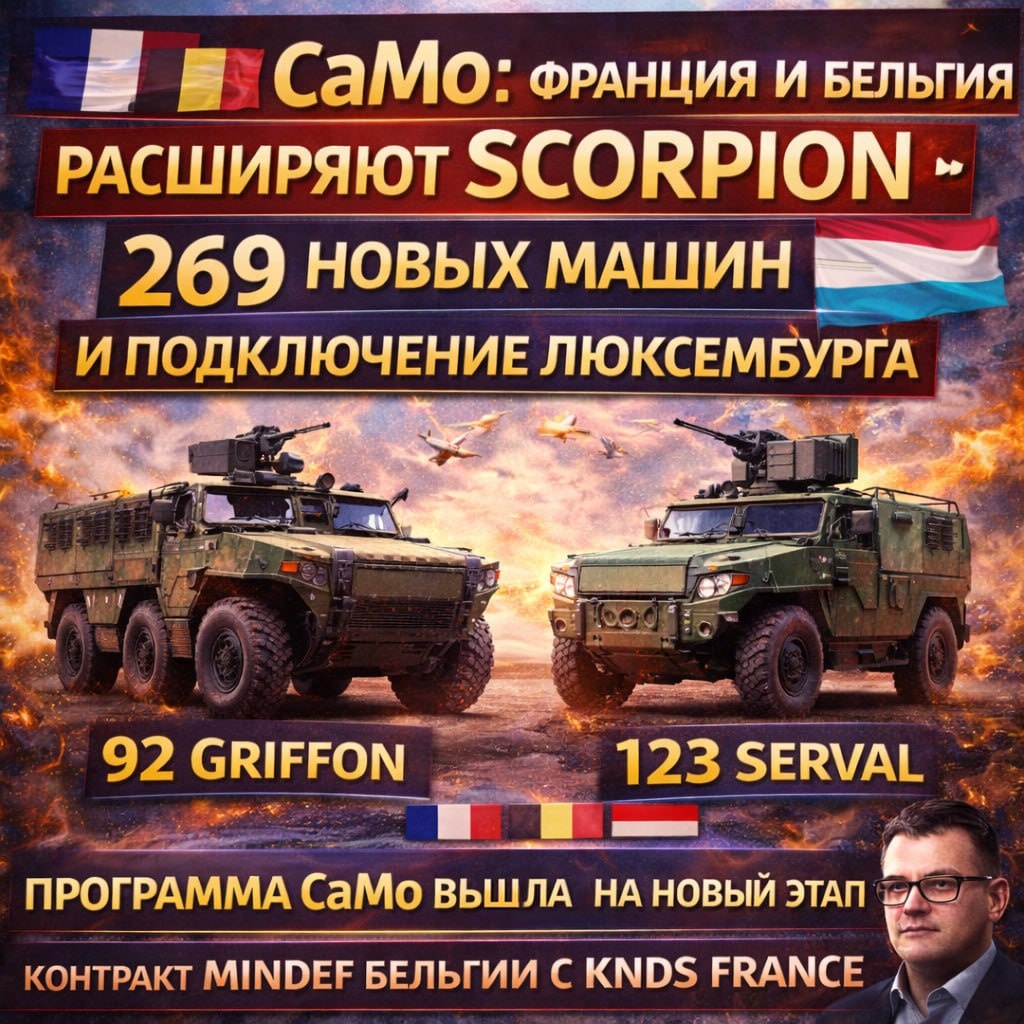 Бельгией и Францией) В рамках контракта от 30.12.2025 заказаны 92 ББМ Griffon и 123 Serval на общую сумму 1,15 млрд евро. Это первый контракт на Serval, разработанную KNDS France и Texelis как часть программы SCORPION, в основном для замены устаревших разведывательных ББМ VAB. Финансирование распределено: 495,6 млн евро на Griffon и 656,4 млн на Serval. С учётом прежних поставок ВС Бельгии будет иметь 498 Griffon (в т.ч. 24 самоходных миномета MEPAC) и 60 разведывательных ББМ Jaguar EBRC с 40-мм пушкой и ПТУР Akeron MP. К программе CaMo официально присоединился Люксембург , заказав 38 Jaguar и 16 Griffon. Решение по закупкам ББМ принято в рамках натовского процесса планирования обороны (NATO Defence Planning Process, NDPP) и закрепляет стандартизацию вооружений в Бенилюксе: вместо содержания разрозненного парка Люксембург получает полную оперативную совместимость с французскими и бельгийскими подразделениями. Производство машин локализовано в Бельгии: основная сборка ведётся на MOL