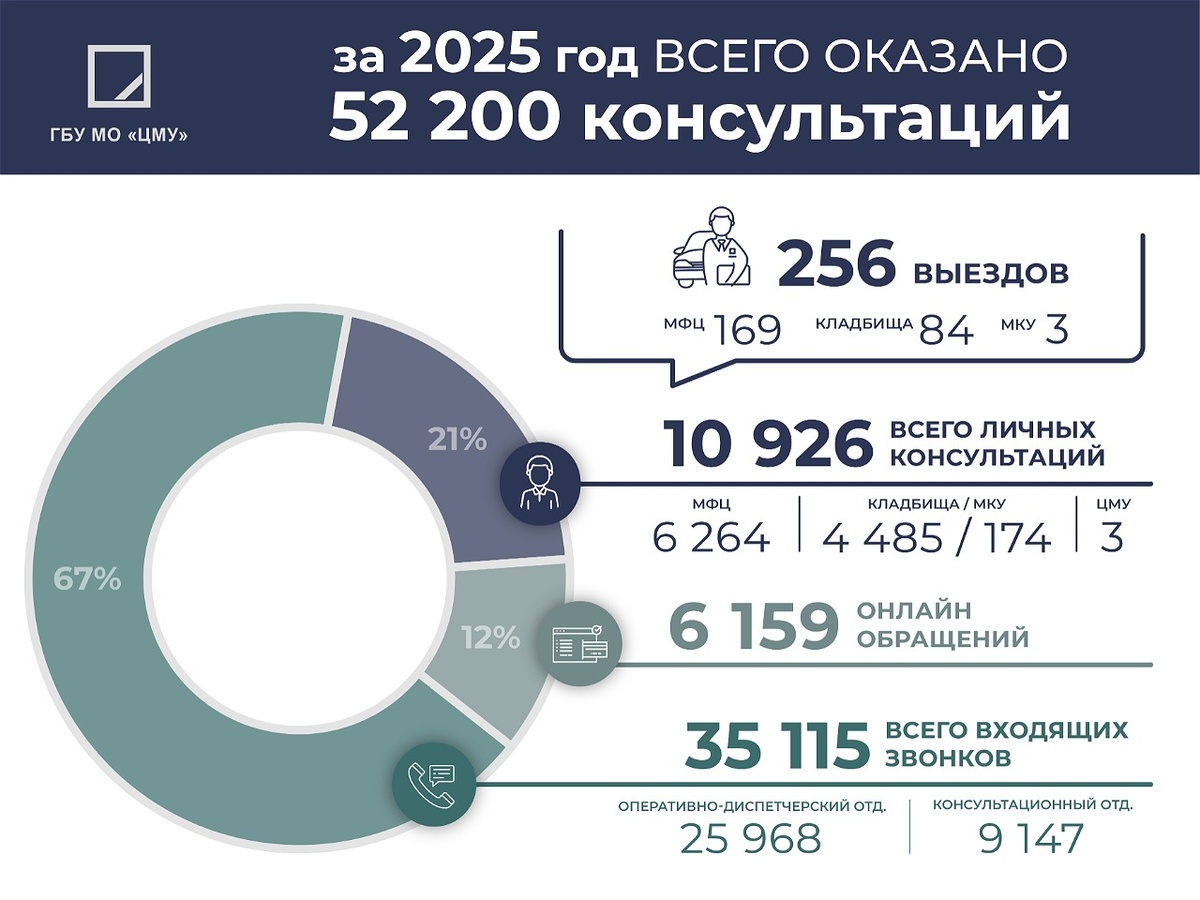 за помощью специалистов учреждения по телефону круглосуточной горячей линии 8 (498) 568-99-99. Также специалисты ГБУ МО «ЦМУ» активно консультируют лично: за год было проведено 6264 консультации в отделениях МФЦ и 4485 консультаций непосредственно на территории кладбищ региона. Традиционно больше всего обращений жителей Московской области поступило по вопросам порядка организации похорон