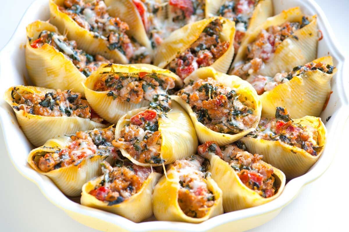 Фаршированные ракушки — это блюдо, которое представляет собой большие макароны (конкилье, или «ракушки») с начинкой внутри. Ракушки могут быть фаршированы различными начинками, например, сыром, мясом, овощами или их комбинацией. Это блюдо может быть как основным, так и дополнением к другим блюдам. Отварите ракушки до состояния аль денте согласно инструкции на упаковке. Откиньте на дуршлаг и дайте остыть. В это время мелко нарежьте лук и чеснок. Обжарьте лук и чеснок на растительном масле до золотистого цвета. Добавьте фарш и обжаривайте до готовности, разбивая комочки фарша лопаткой. Добавьте томатную пасту, сливки (или молоко), соль, перец и специи. Перемешайте и тушите 5–7 минут. Наполните ракушки получившимся фаршем. Выложите ракушки в форму для запекания. Посыпьте тёртым сыром. Запекайте в предварительно разогретой до 180 °C духовке около 20 минут, пока сыр не расплавится и не подрумянится.