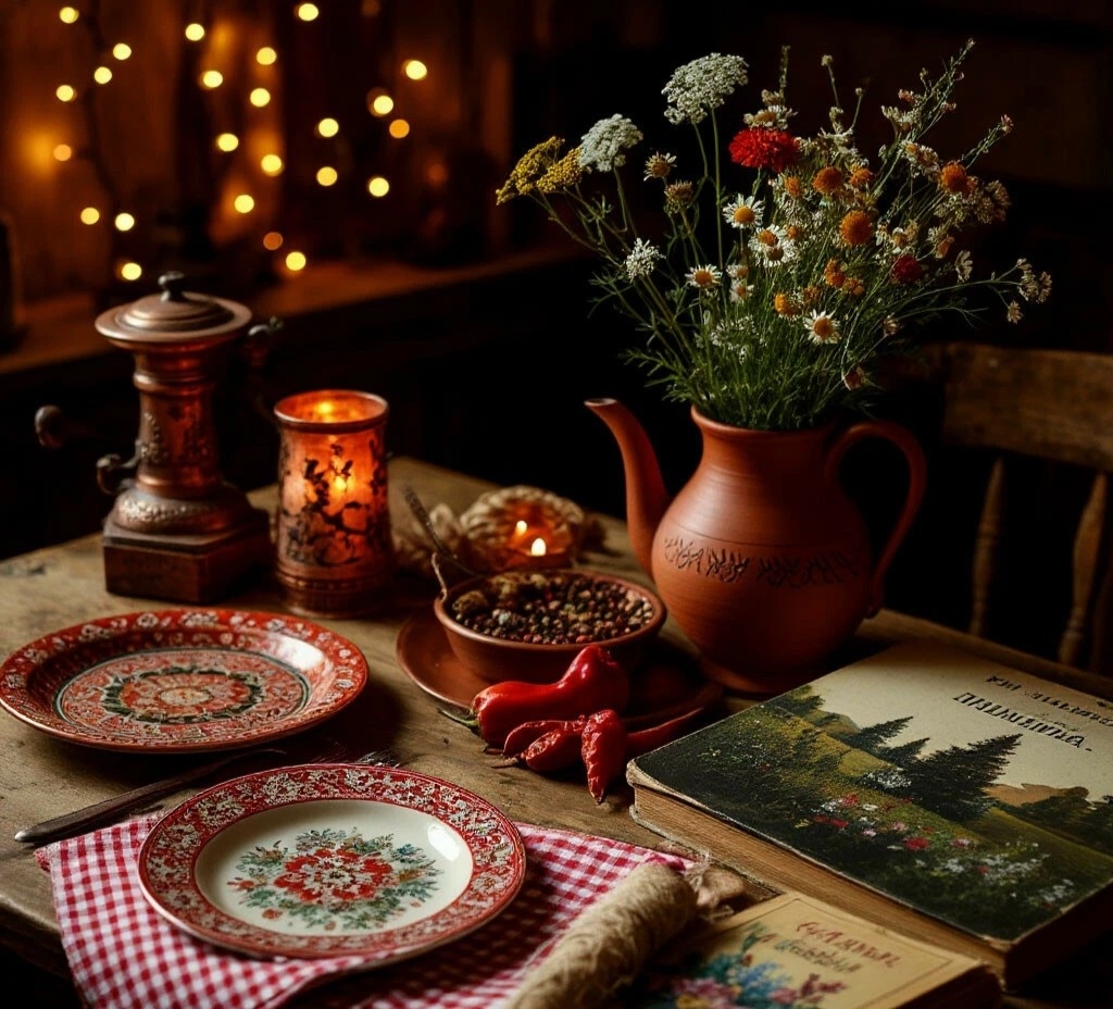 🎨 ЦВЕТА И ДЕКОР: ·Главные цвета: Красный, белый, зелёный — как на флаге Венгрии! 🇭🇺 Используй их в скатерти, салфетках, свечах. Даже просто три свечи этих цветов в центре стола создадут настроение! ·Акценты: Медная посуда — символ венгерского гостеприимства! Если есть медный поднос, турка, кружка — выставляй! 🍶 Керамические горшочки для подачи блюд тоже подойдут. Разложи на столе несколько стручков сушёного сладкого перца или поставь мельницы с паприкой! ·Цветы: Простой букет полевых цветов (даже сухоцветов) в неглазурованном глиняном кувшине добавит деревенского шарма. 🌼