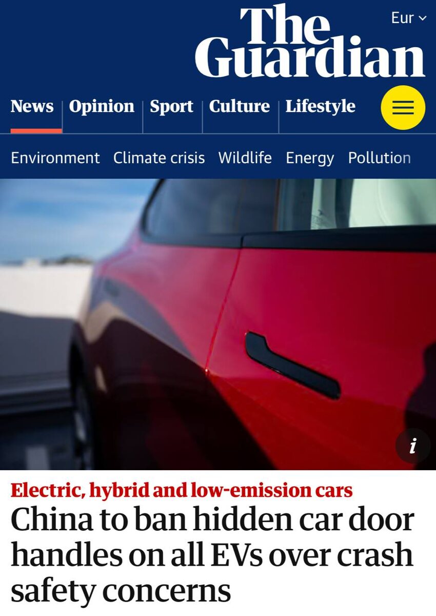 С 1 января 2027 года в Китае все новые модели автомобилей должны оснащаться механическими дверными ручками. Запрет введён после серии смертельных ДТП, когда пассажиры не могли выбраться из салона из-за отказа электронной системы. В настоящее время скрытые дверные ручки установлены у 60% наиболее продаваемых электрокаров и гибридов в стране. https://dzen.ru/id/5c0e38ff46ef5c00aaa80527