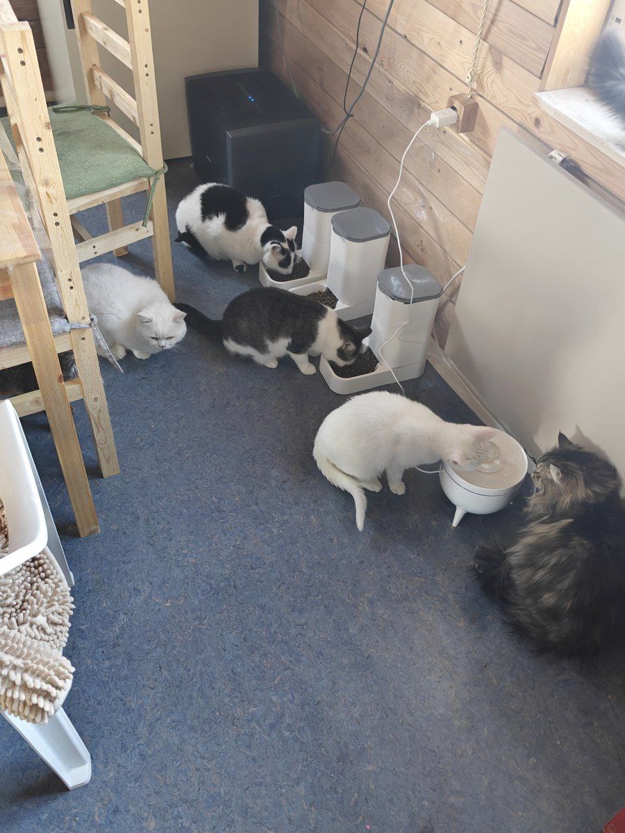 Когда я убираюсь на кухне, выгоняю всех (по возможности). Через двадцать минут все бегут к мискам так, как будто сто лет не ели