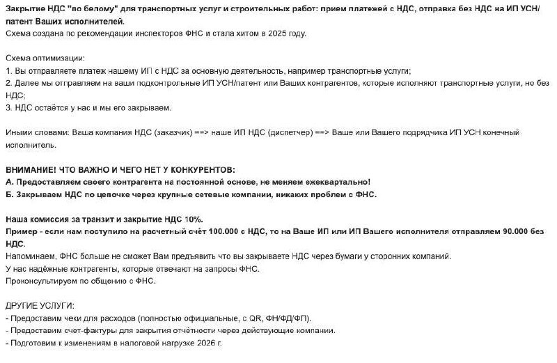 ». Пришло вот такое письмо на почту. То, что они описывают, - это банальнейшая ломка НДС. Самый дешёвый и примитивный схематоз. Его видит любая ФНС. Видит и молчит. Почему молчит? Потому что копит. Копит объём, чтобы потом зайти по особо крупному размеру и открыть уголовное дело. Немного инсайда. У меня есть знакомый, который игрался ровно в такие схемы. И что вы думаете? Реально сел. До конца был уверен, что всё это «игрушки», ведь «документы есть», как пишут подобные ребята. В суд он ездил с улыбкой. У него был последнее заседание, а на вечер уже куплены билеты на концерт с женой. На концерт он не поехал. Он поехал в другое место. На 6 лет.😔 Это реальная история из жизни, а не выдумка. И ещё один важный момент, о котором редко думают. Помимо уголовных рисков здесь есть и другие. Это чистый криминал. Таким «помощникам» ничего не стоит в один день взять ваши деньги и просто оставить их у себя. И куда вы пойдёте? В полицию? С чем? С тем, что хотели купить липовый НДС? Они прек