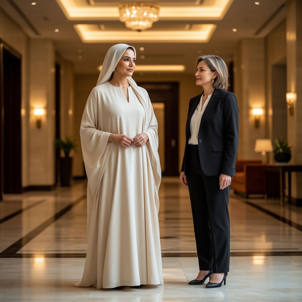 В роскошный отель на побережье, принадлежащий одному из консервативных родственников шейха Тарика, приехала делегация иностранных инвесторов. Среди них была глава крупного французского фонда — женщина лет пятидесяти, в строгом брючном костюме, без головного убора. Во время официального ужина она попросила, чтобы её сопровождала не мужчина-переводчик из министерства, а одна из местных женщин-специалистов, «чтобы лучше понять социальный климат». Начальник протокола, сбитый с толку, в панике позвонил во дворец.