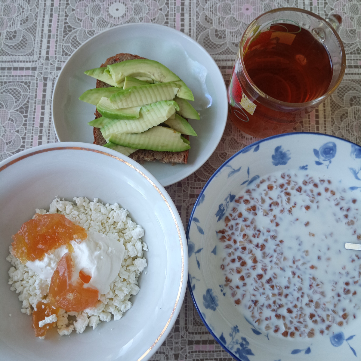 Начала готовить завтрак. Кашу не варила, гречневая была сварена вчера. Разогрела её хорошо, залила молоком, вот и каша готова. Ну и творог с чаем, конечно. Потом проверила авокадо на спелость. Покупала неделю назад, наверное. И вот, наконец, один из двух созрел так, что я могу его съесть. Измельчать не стала, мне и так нравится. Завтрак был сытный. Мне хватило сытости аж до часу дня.