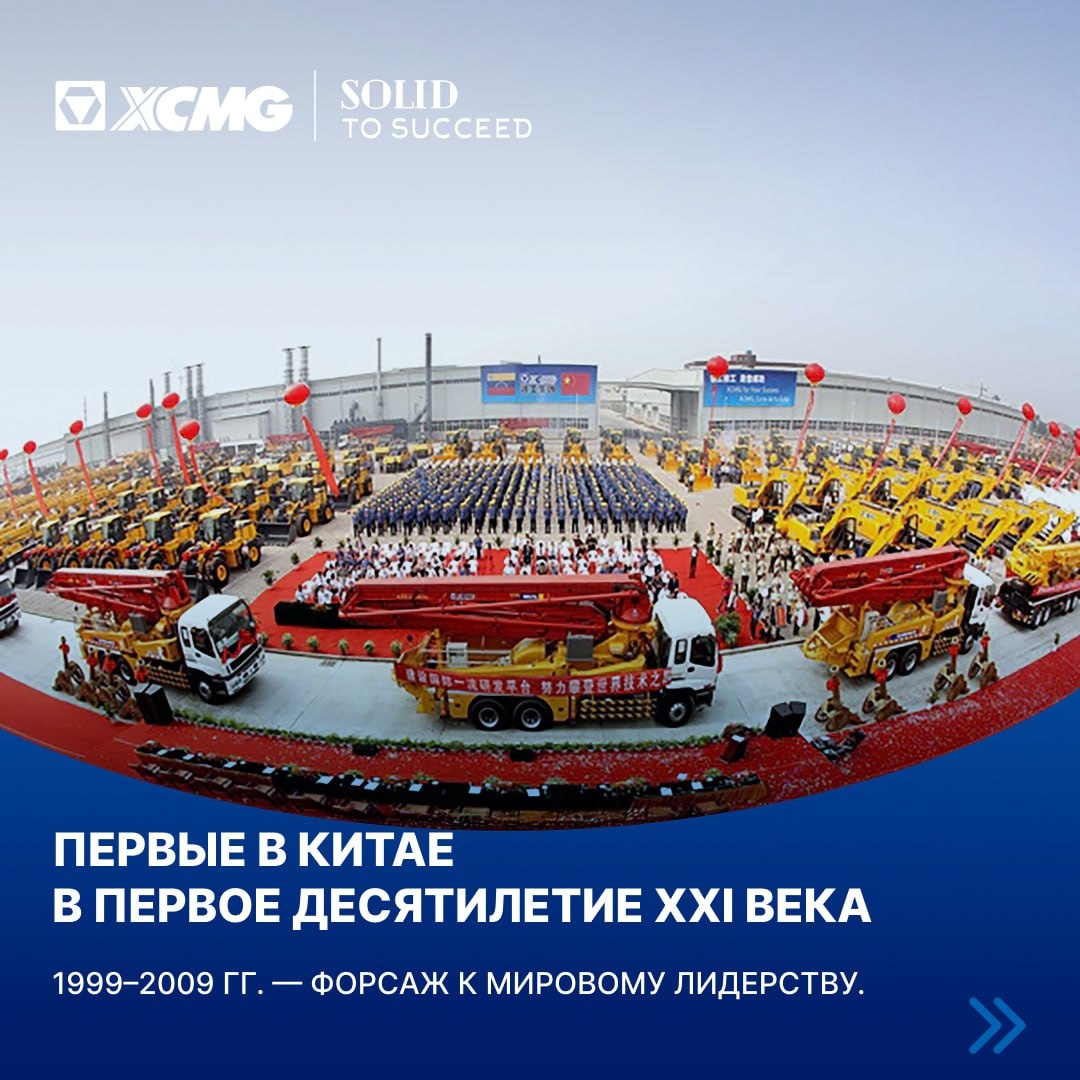 Первое десятилетие XXI века стало для XCMG эпохой решительных свершений, небывалых финансовых успехов, новых технологических прорывов и важных социальных инициатив. 📍Отправной точкой стал 1999 год: новая команда руководителей взяла курс на инновации и быстрый рост. 🏗Уже в 2002 году инженеры XCMG создали первый в Китае шоссейный кран QAY25 — технологическое достижение, открывшее компании мировой рынок подъёмной техники. 📈К 2003 году выручка XCMG превысила 10 млрд юаней (около 1,5 млрд долларов США), и это был рекордный финансовый результат в машиностроительной отрасли Китая. 🌱В 2008 году в структуре группы компаний XCMG было создано специализированное предприятие для развития направления карьерной техники. В том же году состоялось приобретение автомобильного производственного актива с последующим переименованием и интеграцией в структуру группы. ❤️Важно, что в этот период компания была отмечена наградами за вклад в ликвидацию последствий стихийных бедствий. XCMG показала, что у