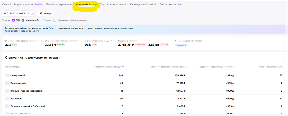 1. Заходим в раздел: Аналитика продавца - История остатков 2. Можем посмотреть по регионам остатки 3. Остатки по складам 4. Если хотим понять стоимость остатков по FBO вычитаем стоимость маркетплесу и стоимость всех остатков или просто убираем галочку маркетплейс 5. Смотрим по складам остатки 6. Смотрим стоимость по складам остатков
