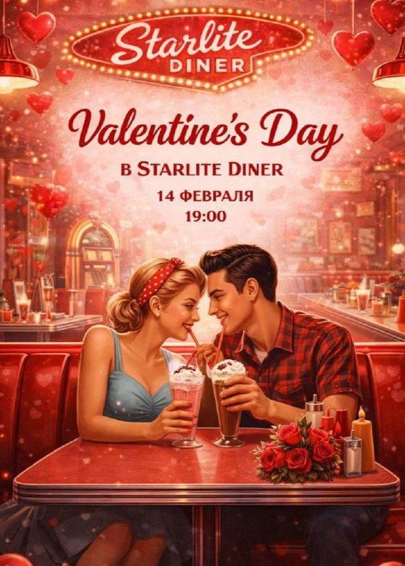 🩷 14 февраля приглашаем отметить День святого Валентина в атмосфере американского дайнера 🪩 Вас ждёт тёплый вечер с развлекательной программой, конкурсами, музыкой и приятными сюрпризами Это идеальный повод провести время вместе, создать новые воспоминания, улыбаться, танцевать и наслаждаться праздничным настроением👩🏼❤️👨🏼 🕖 14 февраля | 19:00 📍 Starlite Diner