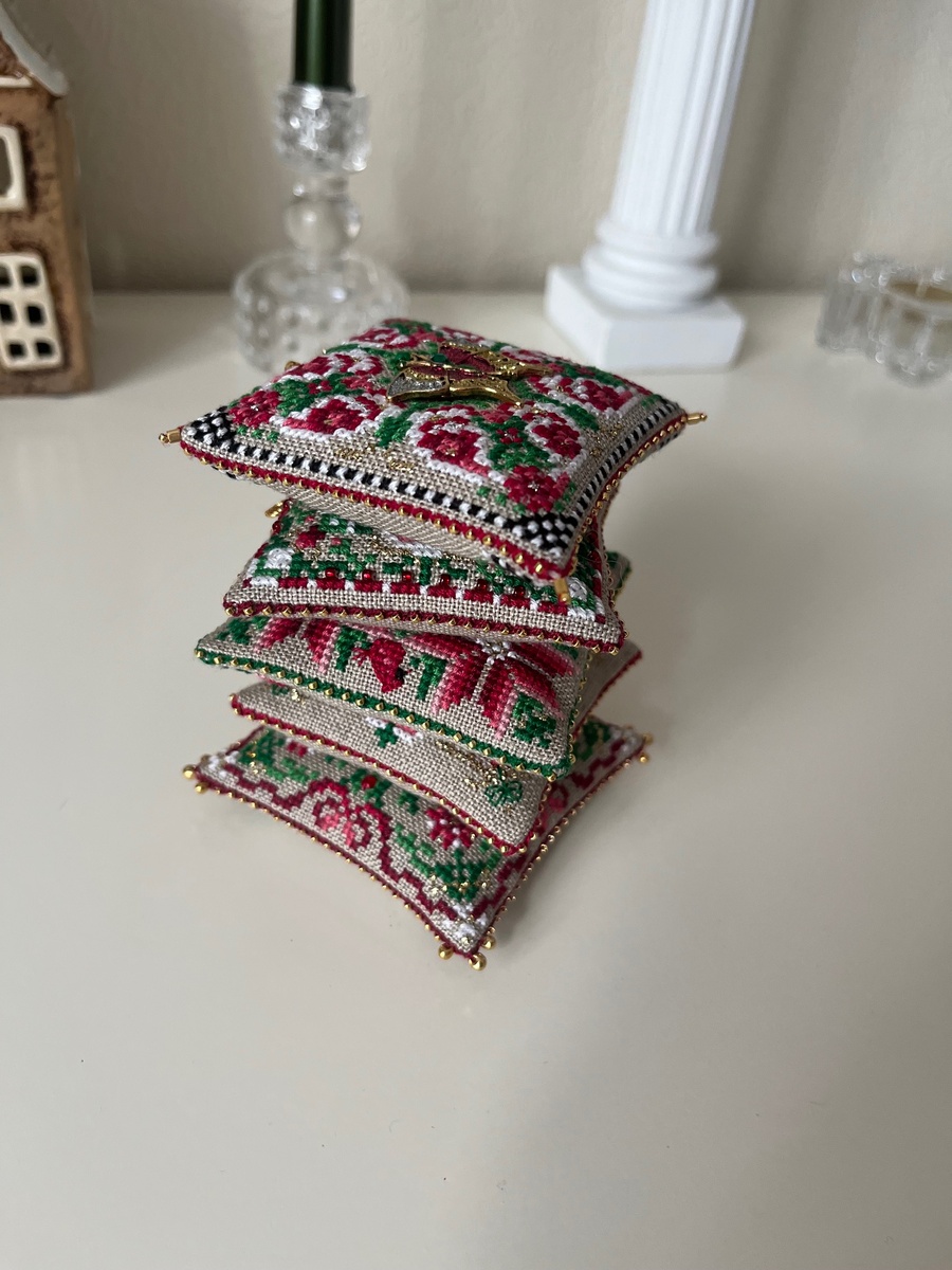 Закончила все пять рождественских подушечек от Just Nan, это лимитированная коллекция у Нан. Основа - лен натурального цвета от Белфаст, брала по ключу, крейник в разных орнаментах рекомендуется разный, но я брала золотой и вышивала в две нити. Лайфхак - т.к. этот крейник очень быстро начинает расслаиваться, то близко к краю я завязывала узелок и вышивать было проще и экономия нитки достаточно неплохая. По периметру всех подушечек я прошивала бисер-петит от Тохо, золотой, номера бисера и крейника на фото ниже. При оформлении подушечки с мышкой в оригинале используются булавки с белой головкой, я заменила их на золотые бусины Миюки двух размеров - дропсы. У них есть 2 размера - 3,2 мм и 2,8 мм, использовала оба эти размера. На сайте Мелодия бисера можно все это купить. Подушечки имеют разный размер, поэтому для равномерности (но это по желанию, конечно) я на маленьких подушечках увеличивала расстояние между вышивкой и бордюром. На мой взгляд, так лучше, особенно если они находятся в о