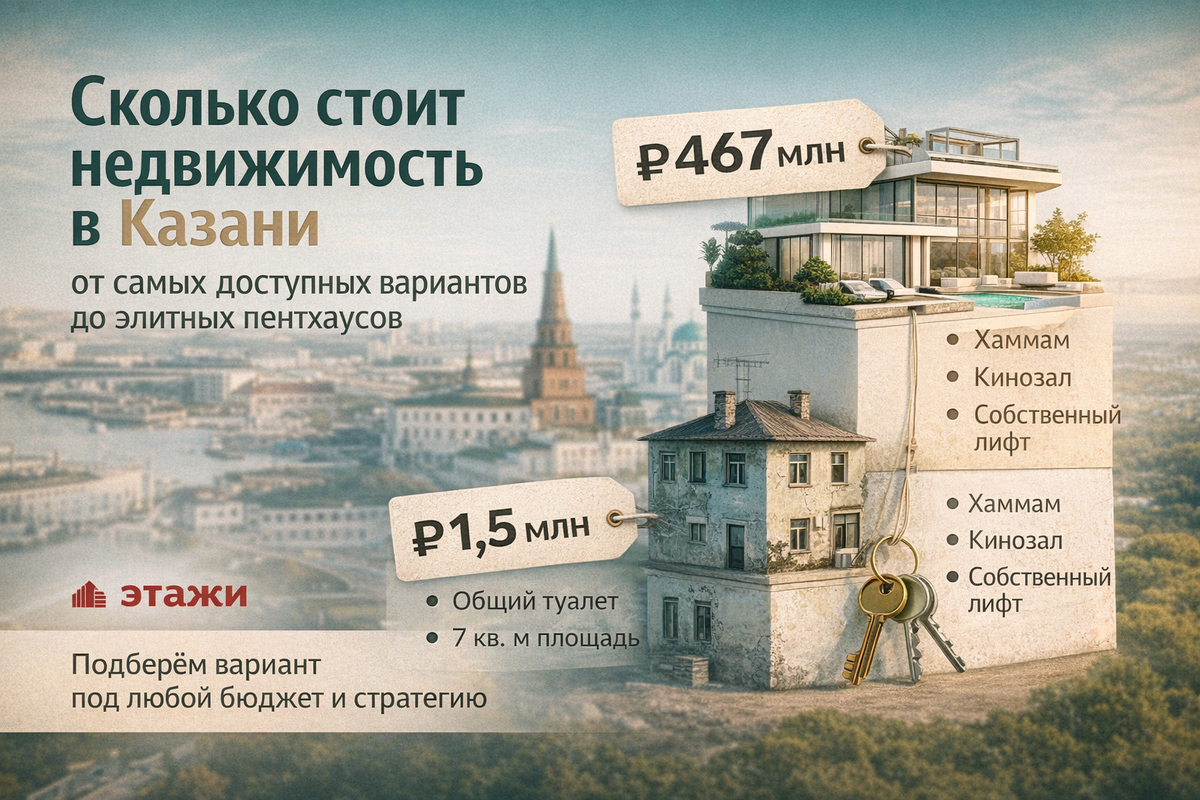 Рынок недвижимости Казани — это всегда контраст. В одном сегменте можно найти небольшие студии со статусом комнаты и общими зонами, а в другом — пентхаусы с собственным лифтом, хаммамом и видом на Кремль. Эксперты компании «Этажи» разобрали, сколько сегодня стоит жильё в городе, кто покупает разные форматы и какие объекты продаются быстрее. По данным открытых площадок, самые бюджетные предложения в Казани стартуют примерно от 1,5–1,8 млн рублей. Это, как правило: Такие квартиры чаще расположены в Кировском районе, Дербышках и локациях, удалённых от центра. В них редко встречается современный ремонт, но именно этот сегмент остаётся востребованным у покупателей с ограниченным бюджетом и инвесторов, которые планируют сделать обновление и сдавать объект в аренду. Кто покупает:
