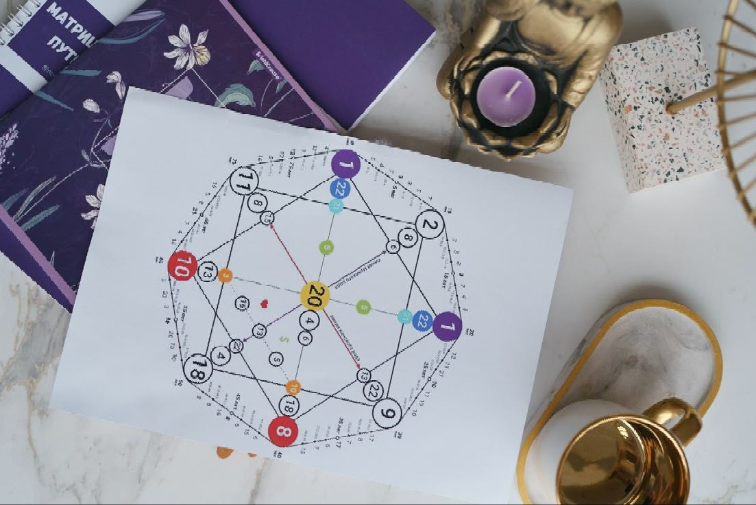 Это не гадание на кофейной гуще, а нумерологический симбиоз из западной нумерологии (цифры) и системы 22 арканов (как в картах Таро, но без карт). В итоге получается такая схема-мандала, где каждая ячейка и линия что-то означают: твои таланты, задачи, точки роста и т.д.
