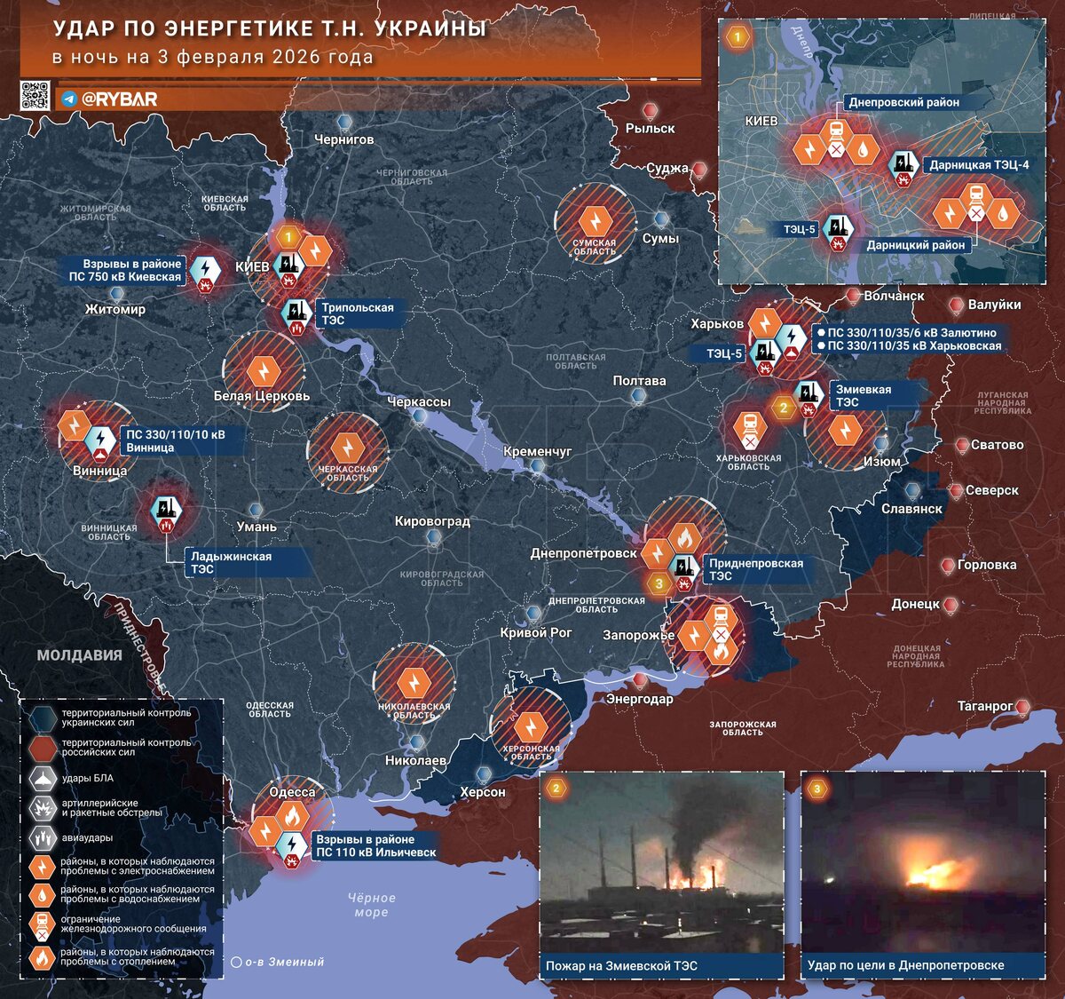 Не успело кончиться перемирие, как в Киеве снова пропал свет. Налёт 12 февраля стал пробой пера перед сегодняшним массовым ударом по энергоузлам и объектам генерации сразу в нескольких регионах противника. 🔸Удары наносились крылатыми и баллистическими ракетами, различными типами БЛА, а также ФАБ с УМПК. После налета в нескольких населенных пунктах произошли массовые отключениям теплоснабжения и перебои в работе транспортных служб. 🔻Куда прилетело? 🔸Традиционно, сильнее всех досталось Киевской области. Взрывы были зафиксированы в районе ТЭЦ-4 и ТЭЦ-5 столицы противника, а также на территории Трипольской ТЭС. Большая часть мощностей этих объектов была направлена на теплоснабжение. На данный момент отопление в городе пропало в 1170 домах, в Дарницком и Днепровском районах происходят аварийные отключения света. Также, по некоторым данным, несколько прилетов ракет пришлись по Наливайковке, где расположена важная для энергосистемы региона ПС 750 кВ Киевская. 🔸В Харькове удар пришелся по