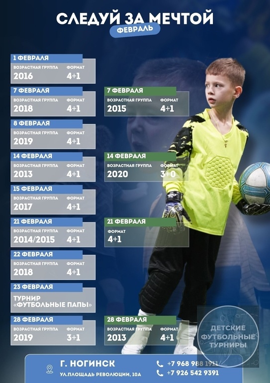 ⚽️🏆 🔹1 февраля - среди команд 2016 г.р / формат 4+1 🔹7 февраля - среди команд 2018 г.р / формат 4+1 🔸7 февраля - среди команд 2015 г.р / формат 4+1 🔹8 февраля - среди команд 2019 г.р / формат 4+1 🔹14 февраля - среди команд 2013 г.р / формат 4+1 🔸14 февраля - среди команд 2020 г.р. / формат 3+0 🔹15 февраля - среди команд 2017 г.р. / формат 4+1 🔹21 февраля - среди команд 2014/2015 / формат 4+1 🔹22 февраля - среди команд 2018 г.р / формат 4+1 🔹23 февраля - Турнир «Футбольные папы» 🔹28 февраля - среди команд 2019 / формат 3+1 🔸28 февраля - среди команд 2013 г.р / формат 4+1 ВАС ЖДУТ: ▫️высокая организация и проведение турнира! ▫️ форматы 4+1, 3+0 ▫️профессиональное судейство ▫️медицинский работник на поле ▫️фото/видео съемка ▫️ призы, кубки и медали для команд, а также отдельных футболистов! Для более подробной информации: 📞 +7 968 988 1911 📞 +7 926 542 9391 --- #ФутбольныйТурнирФевраль2026 #ФутбольныйТурнирМосковскаяОбласть2026 #ФутбольныйТурнирНогинск2026 #Фут