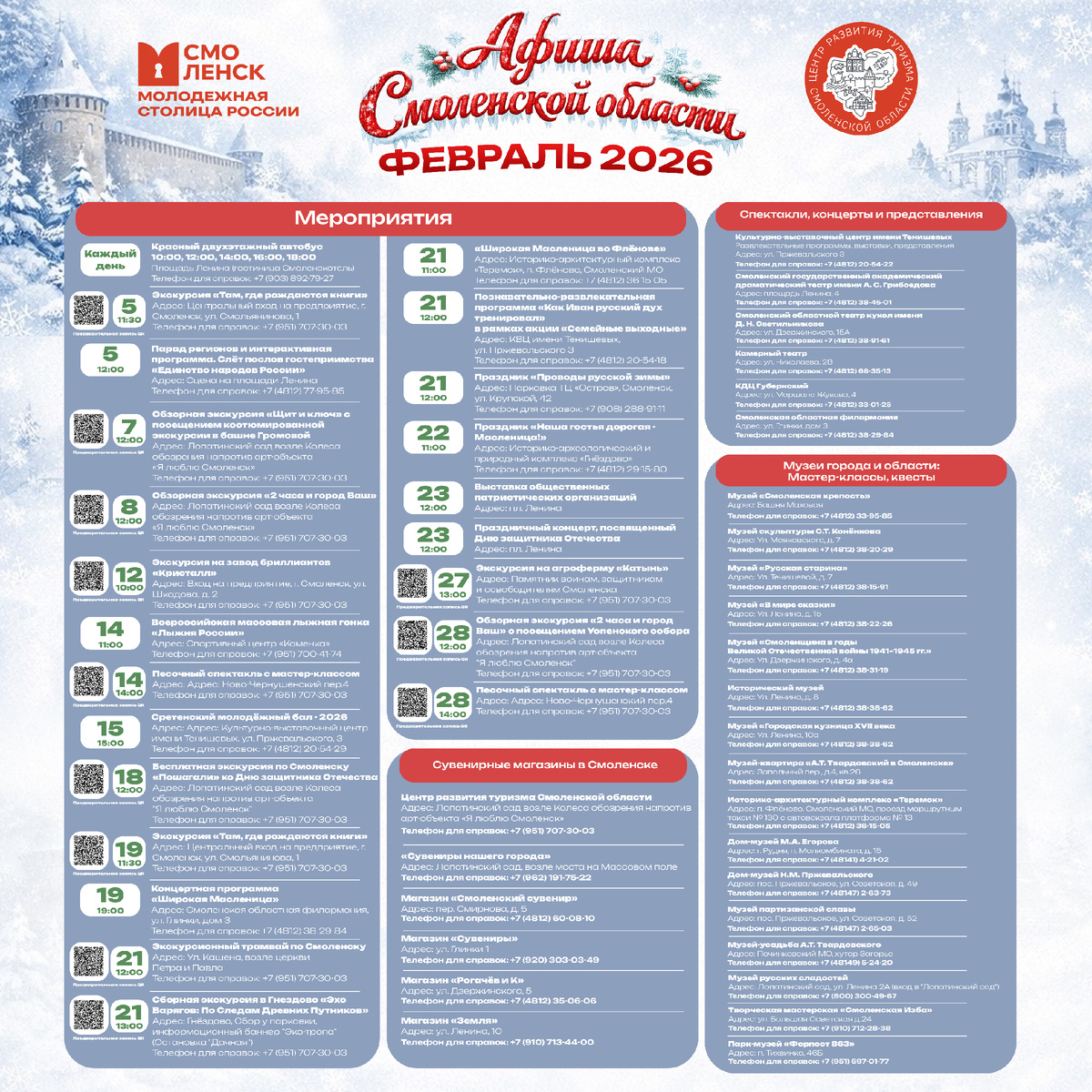 Сохраняйте афишу, делитесь с друзьями и планируйте выходные заранее - зима в Смоленске может быть очень насыщенной