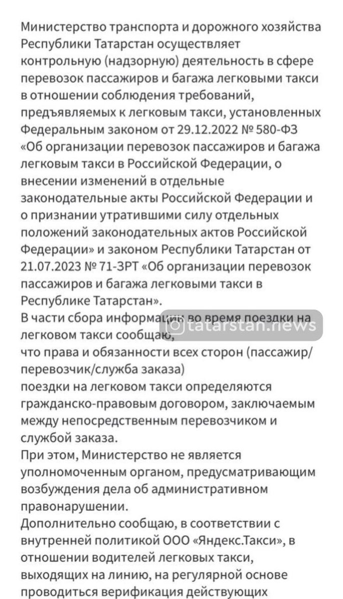 Ведомство заявило, что вопросы работы такси находятся в плоскости гражданско-правовых отношений между пассажиром, перевозчиком и службой заказа, а министерство не является уполномоченным органом для возбуждения дел об административных правонарушениях в таких случаях. Поводом для обращения стала поездка, которую, по словам заявителя, выполнял водитель без необходимых разрешений. Однако в Минтрансе пояснили, что ответственность за проверку водителей лежит на службе заказа, а именно на ООО «Яндекс.Такси». В министерстве также указали, что компания самостоятельно проводит верификацию разрешений водителей в рамках своей внутренней политики. При этом примечательно, что сам Минтранс Татарстана регулярно возбуждает административные дела и штрафует автовладельцев по другим основаниям — например, за неоплату проезда по платным дорогам. В ситуации с такси контроль, включая вопросы легальности водителей и миграционного статуса, фактически полностью переложен на агрегатора. ⭐️ Татарстан News 📲