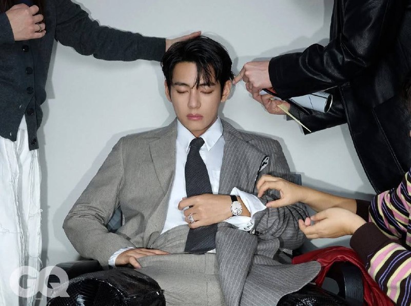 Ви в жакете с многослойными элементами и двухслойных брюках от Moohong для фотосессии GQ Korea.