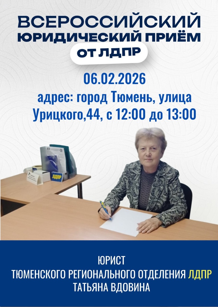 ! Зачастую квалифицированная помощь юриста стоит немалых денег, и не каждый может себе это позволить. В ЛДПР убеждены: правовая поддержка должна быть доступной для всех граждан без исключения. Тюменское региональное отделение ЛДПР приглашает вас на Всероссийский юридический прием от ЛДПР. Прием проведет профессиональный юрист Тюменского регионального отделения Татьяна Вдовина. Вы сможете получить квалифицированную консультацию, помощь в разборе документов и алгоритм действий в вашей ситуации. 📅 Когда: 6 февраля 2026 года (пятница) 🕑 Время: с 12:00 до 13:00 📍 Где: город Тюмень, ул. Урицкого, 44 (Приемная депутата ЛДПР) Записаться можно по номеру телефона: +7 (3452) 42 62 52. Не оставайтесь со своими проблемами один на один. Мы поможем разобраться!