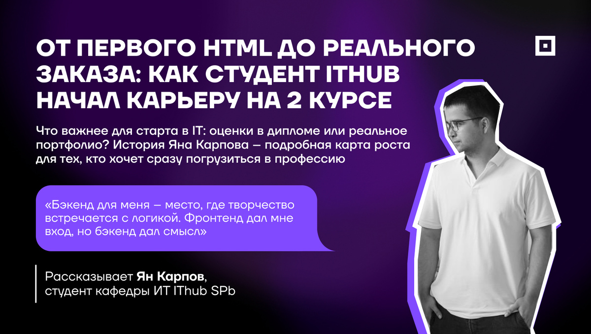 Это история о поиске своего места в IT. Ян Карпов начинал с фронтенда, вдохновляясь видимым результатом, но вскоре его потянуло к тому, что скрыто «под капотом». В IThub SPb он нашёл не просто учёбу, а среду, где можно пробовать, ошибаться и менять вектор. За время учёбы он прошёл путь от первой HTML-страницы до реальных проектов для крупных компаний, осознав, что бэкенд – это место, где творчество встречается с архитектурой. Вам предстоит прочитать его честный рассказ о том, как выбрать направление в IT, пережить первый курс и понять, что настоящий рост начинается там, где заканчивается зона комфорта. От фронтенда к бэкенду «Когда я впервые заинтересовался IT, я не представлял, сколько ролей существует в разработке. Моим входом стал фронтенд: я написал пару строк на HTML, кнопка появилась на экране, и я подумал: «Вау, я могу создавать что-то видимое, настоящее!». Это было вдохновляюще. Но чем глубже я погружался, тем сильнее тянуло к вопросам: почему данные приходят именно так? Кто р