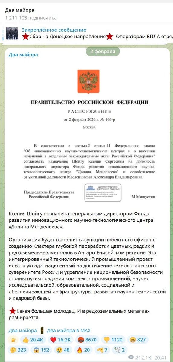 Вчера мы опубликовали пост про Ксению Шойгу, назначенную на новую должность. Обратили внимание на неадекватное количество реакций за ночь. Так, при пиковых суммарных значениях в 10 тыс. реакций (а в среднем - 2-3 тыс.) на пост, за ночь появилось 36 тысяч. "Лайков" и "сердечек", разумеется. Или ночью читатели резко испытали чувство необузданной любви, или кто-то нехило потратил бабок на накрутку, как и еще к паре постов про успехи Ксении. Нам кажется, всё же второе. "Два майора" Сальное Дифлопэ