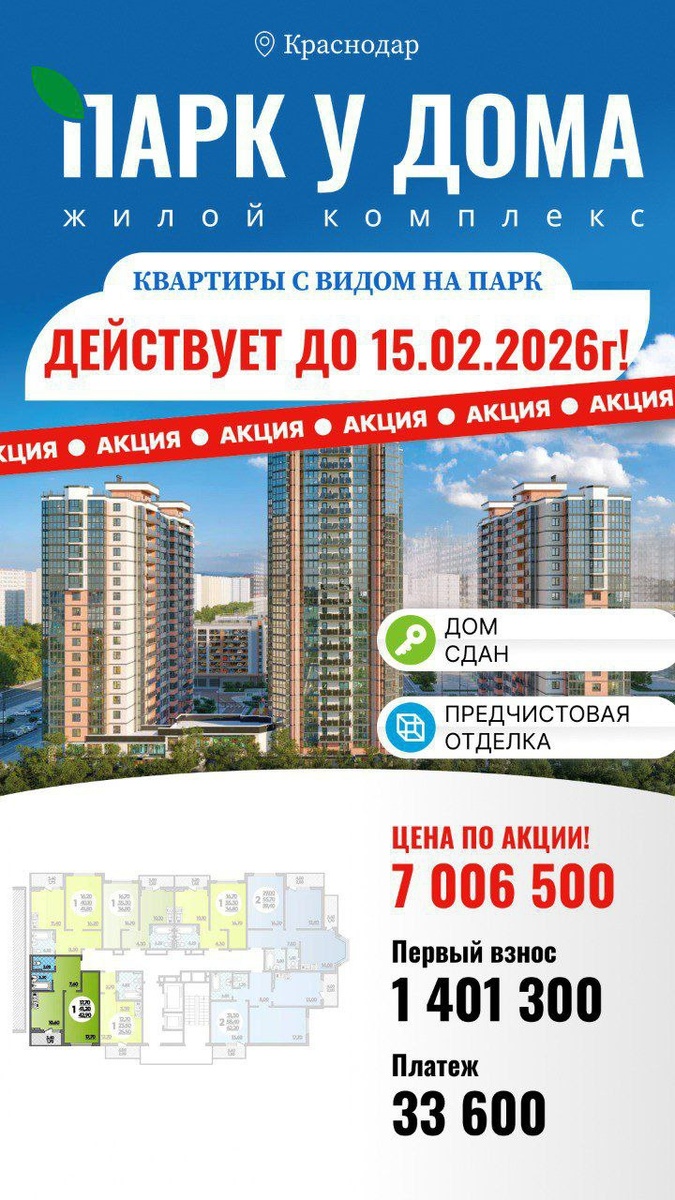 ! 🔥 Друзья, если вы мечтали выходить из дома и через пару минут оказываться в лучшем парке страны — сейчас тот самый момент. В ЖК «Парк у Дома» (который буквально соседствует с локацией мечты) сейчас происходит атракцион невиданной щедрости, но строго до 15 февраля! Что отдают со скидкой: 🌳 Видовые квартиры: Те самые лоты, где из окна видно не соседский балкон, а панораму города и зелень. До 15.02 на них действует спеццена. 🚗 Паркинг с выгодой: Вы же знаете, что в этом районе иногда припарковаться сложнее, чем выиграть в лотерею? Сейчас скидки на машиноместа такие, что лучше забрать его вместе с квартирой, чем потом искать место в соседних дворах. «Зачем мне ты, если я могу пойти к застройщику напрямую?» 🤨 Хороший вопрос! Рассказываю, почему со мной ты в плюсе: Честный взгляд: Застройщик никогда не скажет о минусах своего ЖК. А я — скажу. Я подсвечу все нюансы расположения, пробок и качества отделки. Эксклюзивные шахматки: У меня в руках часто есть квартиры, которые застройщик