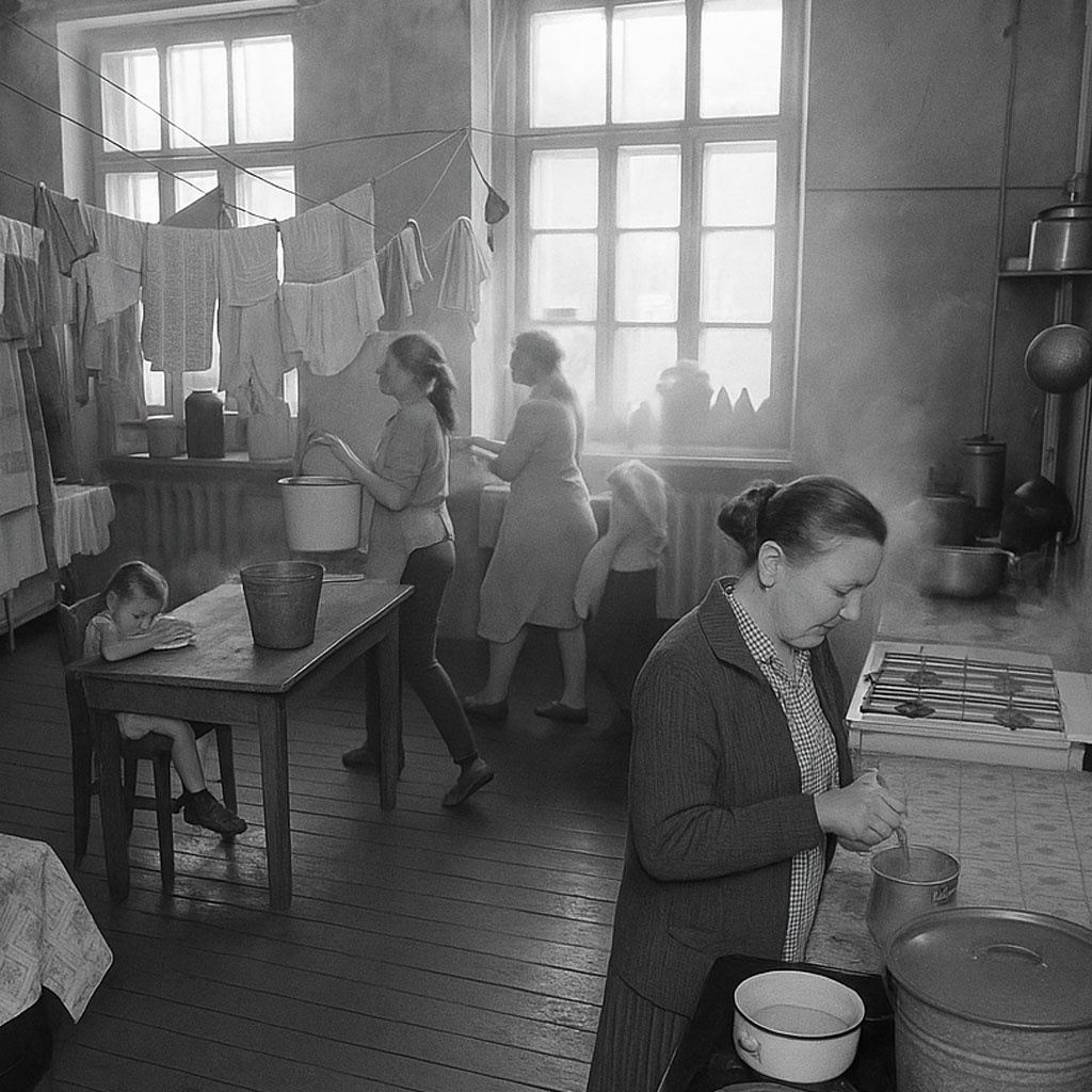 Запах коммунальной квартиры ни с чем не перепутаешь. Он тянется ещё с лестничной клетки: жареный лук, суп на плите, высыхающее на верёвках бельё, немного табака и знакомые духи, которые держатся в воздухе неделями. За тяжёлой входной дверью не просто квартира, а маленький мир, где у каждого своя комната, но кухня, коридор и ванная общие.