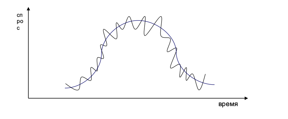 При этом есть какое-то стабильное среднее поведение товара. Данное поведение может показывать суммарный рост или спад спроса на продукт в длительной перспективе. Или поведение спроса может не меняться в той же длительной перспективе. Это общее поведение спроса (объема продаж) можно назвать тенденцией, которая соответствует месту продукта в его жизненном цикле. В свою очередь, под жизненном циклом понимают срок присутствия товара в ассортименте.