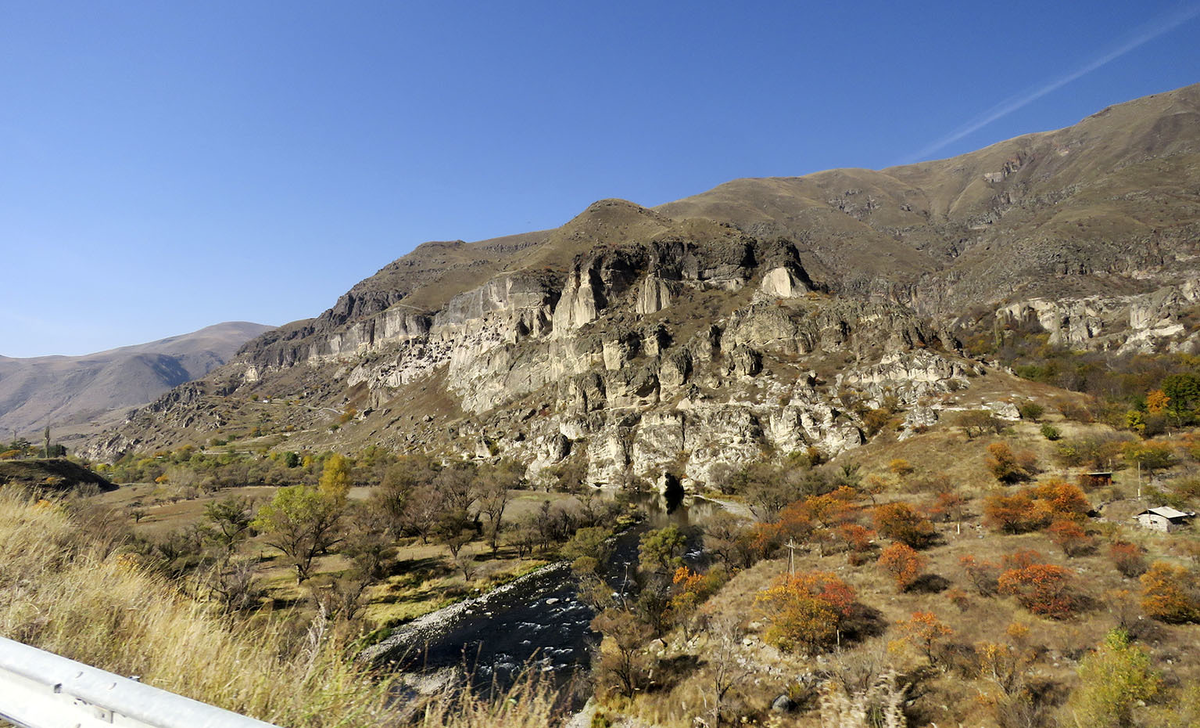 Вдоль Куры километрах в 30 от Ахалцихе начинается самая что ни на есть висячая долина с широким плодородным дном. В скалах над ней можно разглядеть что-то вроде ласточкиных нор - слева от дороги, на нашем берегу, остаётся Ванис-Квебеби, разраставшийся в пещерах скального амфитеатра с 8 века город, к 16 веку заместившийся монастырём. За Курой же проступает наша цель - та самая Вардзиа, о впечатлениях которой каждый грузин уважительно спросит чужестранца: