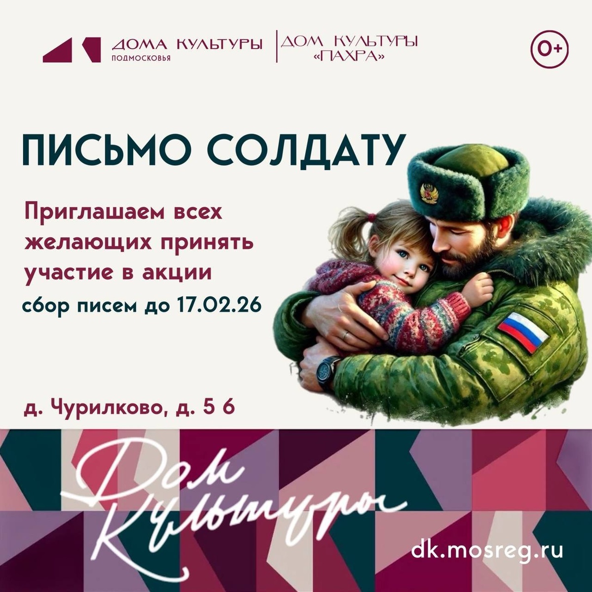 ✨ Дорогие друзья и жители нашего замечательного округа! 🇷🇺 Приглашаем вас принять участие в акции и написать солдату письмо-открытку. На протяжении последних лет у наших защитников стоит непростая задача. Они далеко от дома, своих семей и друзей. В преддверии 23 февраля хотим подарить частичку тепла и поддержать боевой дух участников СВО 📝✉ ☀ Рисунок ❤ Тёплые слова 💪 Пожелания Ваше искреннее письмо станет для бойца самым дорогим подарком и мощным источником сил! Все собранные письма будут переданы в добровольную волонтерскую организацию «Птички ДМД» ⏰ Срок сбора: до 19.02.2026г. 🚫 Возраст: 0+ 🏢 Сельский дом культуры (СДК) «Пахра» 📍 г.о.Домодедово, дер.Чурилково, ул.Чурилково, д.5Б ✅ Мероприятия Домодедово https://dzen.ru/id/66f10385cc4c5a16f7b5fb02 http://vk.com/domodedovo_events http://dzen.ru/domodedovo_events