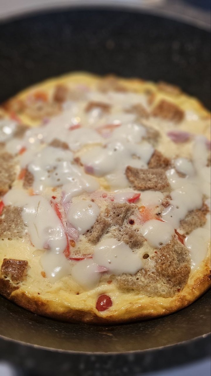 ♥️ Яйца 5 шт. 150 мл. Молока Взбить миксером до пены. Добавить кусочки черного хлеба, красный сладкий перец,половинки помидора черри, соль, перец по вкусу. Выливаем в глубокую сковороду, у нас тефаль, немного растительного масла. На большой огонь под крышку на 2 минуты, потом убавить на маленький , крышку не открываем. Под финал высыпаем мелкопорезанный сыр моцарелла и опять под крышку. Волшебно, как в ресторан сходила♥️