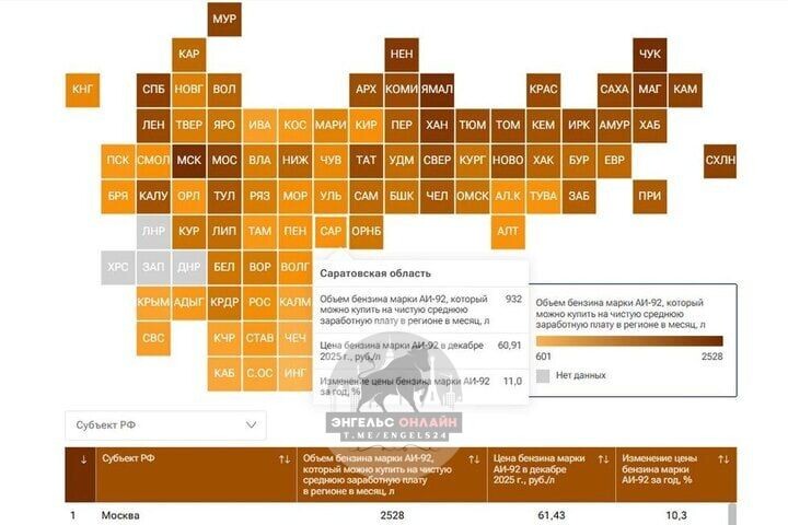 Саратовская область по итогам 2025 года оказалась в числе 20 аутсайдеров рейтинга российских регионов по доступности бензина. Результаты ежегодного исследования опубликовало сегодня, 2 февраля, РИА Новости. В целом по стране за год рост бензиновых цен значительно превысил инфляцию и составил 11,3%. Причиной резкого роста цены во второй половине года стал сезонный высокий спрос в период отпусков и активных сельскохозяйственных работ. При этом дефицит образовался также вследствие незапланированных ремонтных работ на крупных НПЗ, отмечают эксперты. Рейтинг строится на основе ранжирования регионов по объему наиболее распространенной в России марки бензина АИ-92, который может приобрести житель того или иного субъекта РФ на среднюю в регионе чистую заработную плату без НДФЛ. Объем бензина, доступный на заработную плату, определялся путем деления среднемесячной зарплаты в регионе за вычетом НДФЛ за годовой период с ноября 2024 года по октябрь 2025 года на среднюю в регионе цену бензина в д