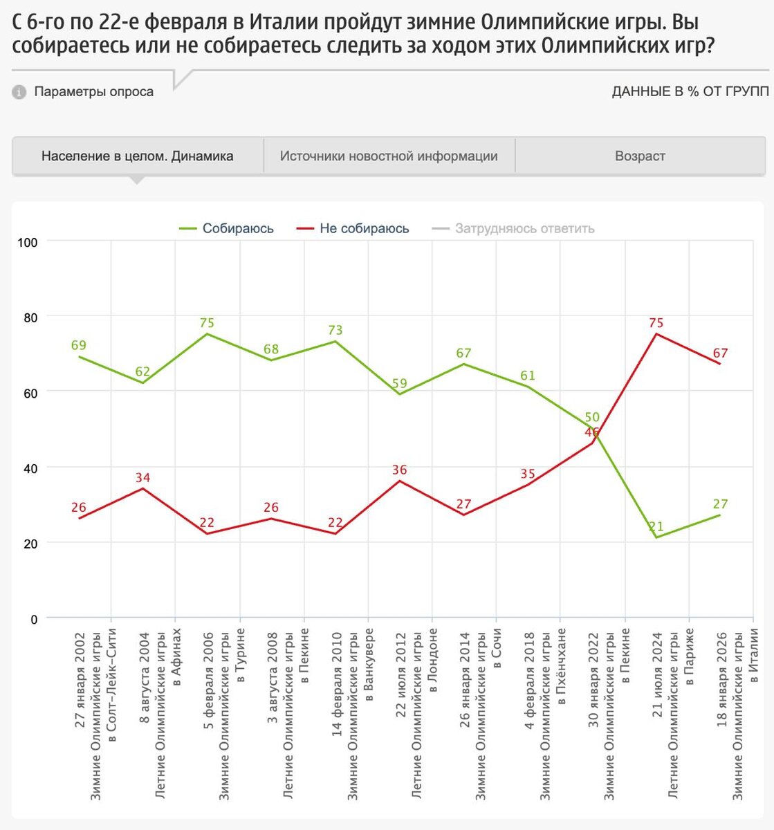 С 6 по 22 февраля в Италии пройдут зимние Олимпийские игры. 57% россиян считают, что эту Олимпиаду нужно показать на российском телевидении, поскольку она вызывает интерес у многих зрителей. 24% опрошенных полагают, что показ не нужен, так как сборная России не будет участвовать под своим гимном и флагом. Международный олимпийский комитет (МОК) не допустил сборную России к участию в зимних Олимпийских играх. При этом МОК допустил к участию под нейтральным флагом некоторых российских спортсменов. 38% опрошенных считают, что спортсмены не должны выступать под нейтральным флагом, так как это проявление патриотизма и нужно гордиться своей страной, не унижаясь. 45% респондентов допускают участие под нейтральным флагом, поскольку спортсмены долго готовились к этому событию. Подробнее: fom.ru #спорт #олимпиада 📱 Фонд Общественное Мнение
