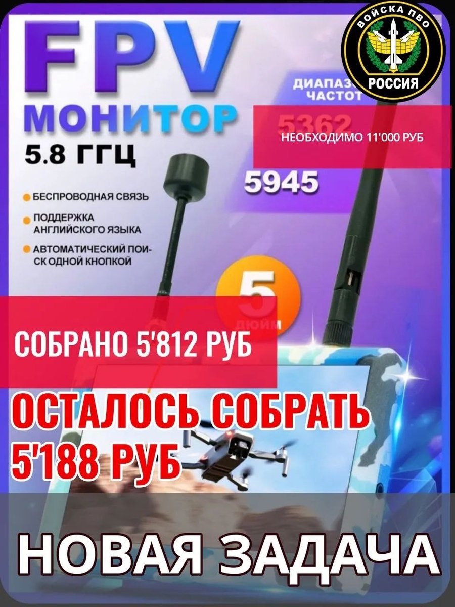 : 🖥 FPV МОНИТОР 📌Сумма к сбору - 11'000 руб. 🔺Собрано: 5'812 руб. 🔺Осталось собрать - 5'188 руб. Ребята ПВО прикрывают войска и объекты от действий средств воздушного нападения противника. Любую посильную сумму можно перевести на номер карты 💳2202208188194204 или по номеру телефона 📞+79530562233 Получатель - Светлана Владимировна Л. ("Сбербанк") #уралсвоихнебросает #вместемысила